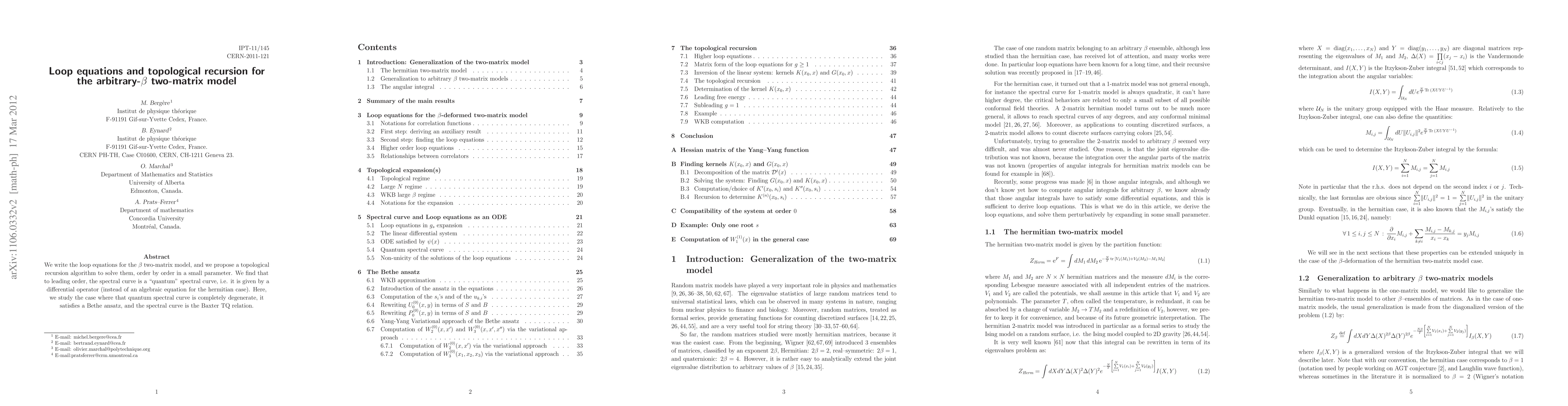 We write the loop equations for the $\beta$ two-matrix model, and we propose a topological recursion algorithm to solve them, order by order in a small parameter. We find that to leading order, the spectral curve is a "quantum" spectral curve, i.e. it is given by a differential operator (instead of an algebraic equation for the hermitian case). Here, we study the case where that quantum spectral curve is completely degenerate, it satisfies a Bethe ansatz, and the spectral curve is the Baxter TQ relation.