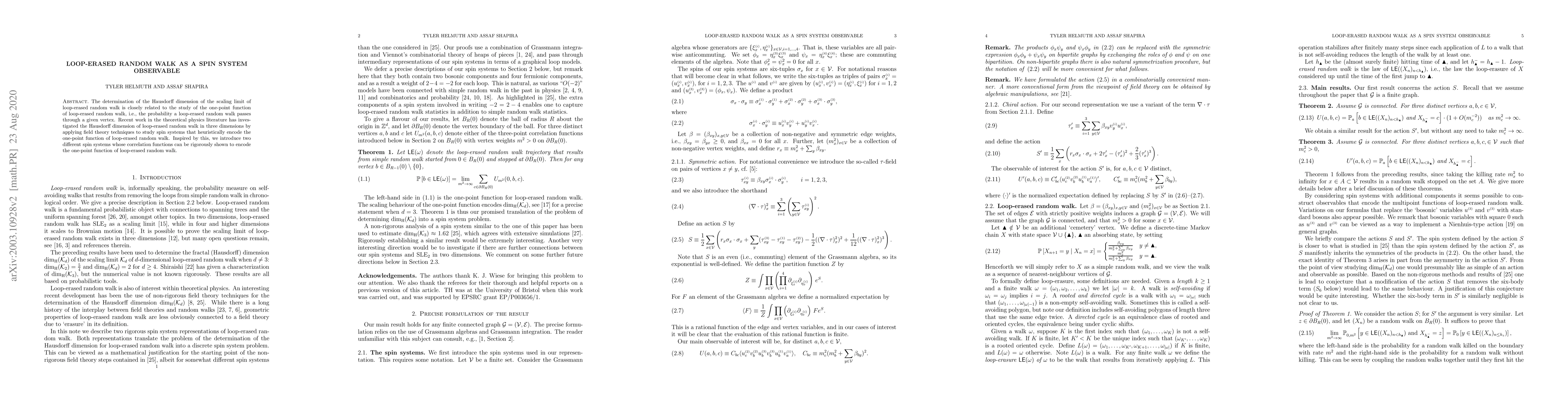 This paper introduces two spin systems whose correlation functions encode the one-point function of loop-erased random walk, providing a rigorous framework for studying the Hausdorff dimension of its scaling limit in three dimensions using field theory techniques.
