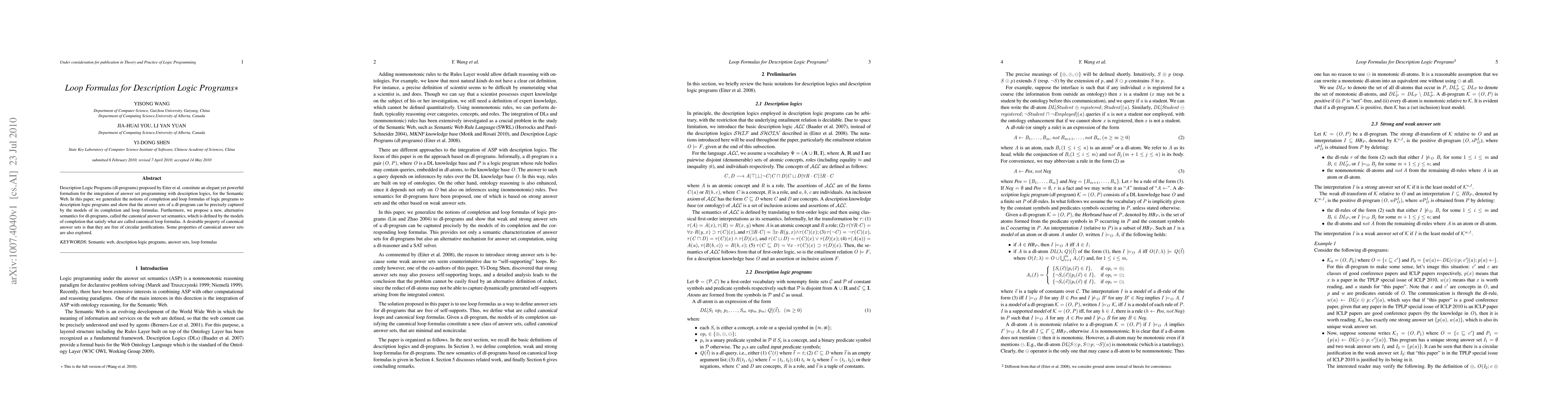 Description Logic Programs (dl-programs) proposed by Eiter et al. constitute an elegant yet powerful formalism for the integration of answer set programming with description logics, for the Semantic Web. In this paper, we generalize the notions of completion and loop formulas of logic programs to description logic programs and show that the answer sets of a dl-program can be precisely captured by the models of its completion and loop formulas. Furthermore, we propose a new, alternative semantics for dl-programs, called the {\em canonical answer set semantics}, which is defined by the models of completion that satisfy what are called canonical loop formulas. A desirable property of canonical answer sets is that they are free of circular justifications. Some properties of canonical answer sets are also explored.