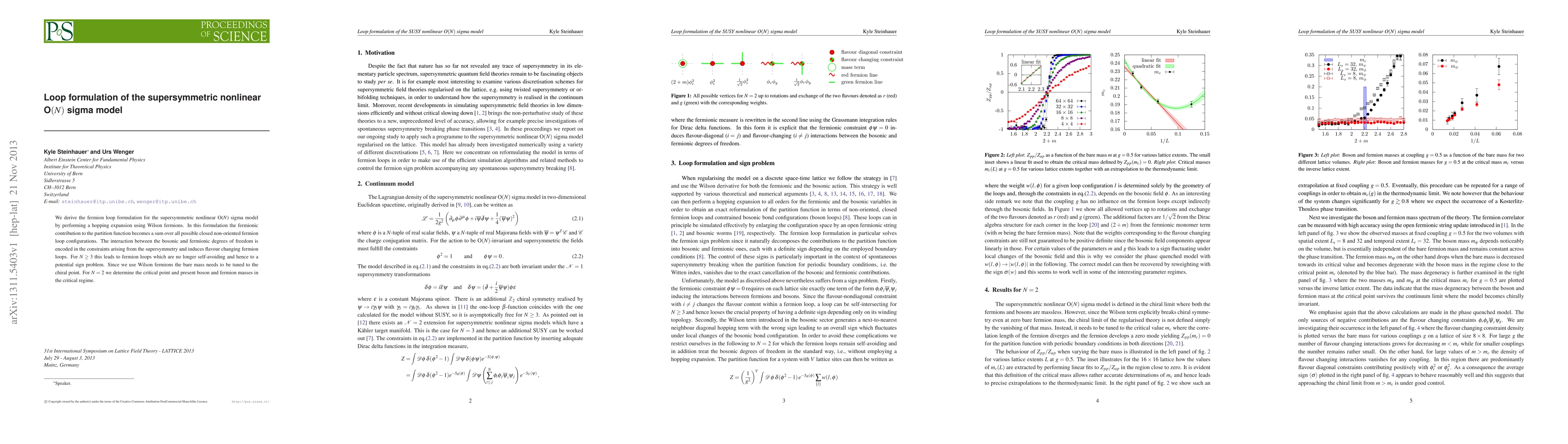 We derive the fermion loop formulation for the supersymmetric nonlinear O$(N)$ sigma model by performing a hopping expansion using Wilson fermions. In this formulation the fermionic contribution to the partition function becomes a sum over all possible closed non-oriented fermion loop configurations. The interaction between the bosonic and fermionic degrees of freedom is encoded in the constraints arising from the supersymmetry and induces flavour changing fermion loops. For $N \ge 3$ this leads to fermion loops which are no longer self-avoiding and hence to a potential sign problem. Since we use Wilson fermions the bare mass needs to be tuned to the chiral point. For $N=2$ we determine the critical point and present boson and fermion masses in the critical regime.