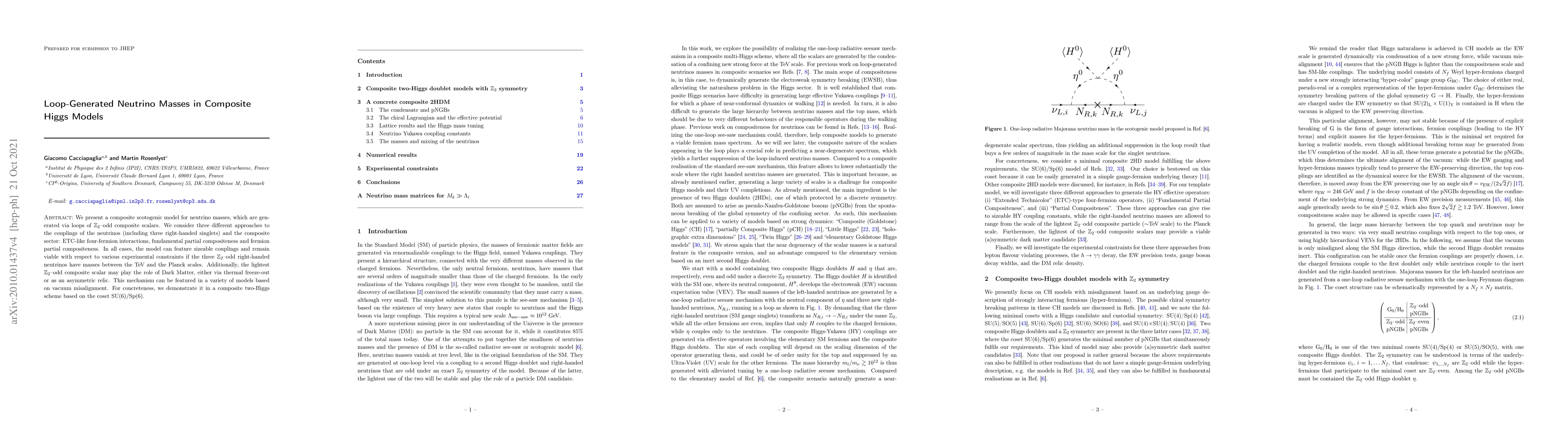 We present a composite scotogenic model for neutrino masses, which are generated via loops of $\mathbb{Z}_2$-odd composite scalars. We consider three different approaches to the couplings of the neutrinos (including three right-handed singlets) and the composite sector: ETC-like four-fermion interactions, fundamental partial compositeness and fermion partial compositeness. In all cases, the model can feature sizeable couplings and remain viable with respect to various experimental constraints if the three $ \mathbb{Z}_2 $-odd right-handed neutrinos have masses between the TeV and the Planck scales. Additionally, the lightest $\mathbb{Z}_2$-odd composite scalar may play the role of Dark Matter, either via thermal freeze-out or as an asymmetric relic. This mechanism can be featured in a variety of models based on vacuum misalignment. For concreteness, we demonstrate it in a composite two-Higgs scheme based on the coset SU(6)/Sp(6).