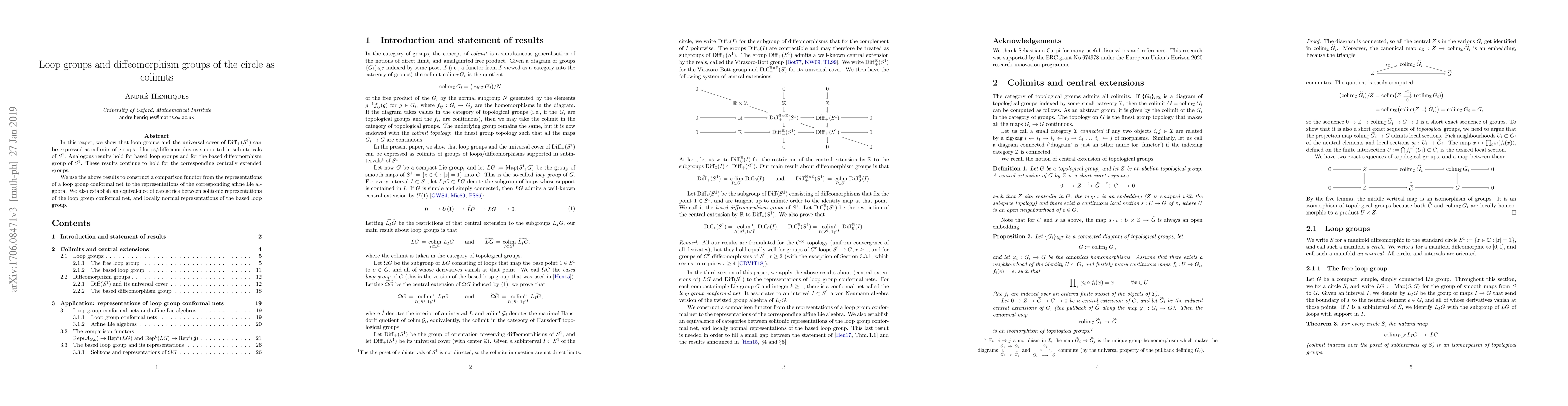 This paper demonstrates that loop groups and the universal cover of the positive diffeomorphism group of the circle can be represented as colimits of groups of loops/diffeomorphisms in subintervals. It also constructs a functor comparing loop group conformal net representations to affine Lie algebra representations and establishes an equivalence between solitonic and locally normal representations.