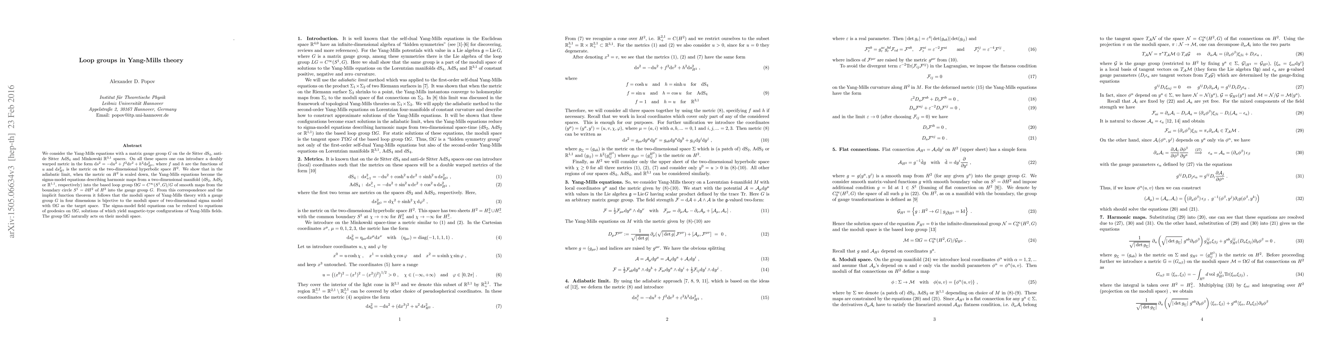 We consider the Yang-Mills equations with a matrix gauge group $G$ on the de Sitter dS$_4$, anti-de Sitter AdS$_4$ and Minkowski $R^{3,1}$ spaces. On all these spaces one can introduce a doubly warped metric in the form $d s^2 =-d u^2 + f^2 d v^2 +h^2 d s^2_{H^2}$, where $f$ and $h$ are the functions of $u$ and $d s^2_{H^2}$ is the metric on the two-dimensional hyperbolic space $H^2$. We show that in the adiabatic limit, when the metric on $H^2$ is scaled down, the Yang-Mills equations become the sigma-model equations describing harmonic maps from a two-dimensional manifold (dS$_2$, AdS$_2$ or $R^{1,1}$, respectively) into the based loop group $\Omega G=C^\infty (S^1, G)/G$ of smooth maps from the boundary circle $S^1=\partial H^2$ of $H^2$ into the gauge group $G$. From this correspondence and the implicit function theorem it follows that the moduli space of Yang-Mills theory with a gauge group $G$ in four dimensions is bijective to the moduli space of two-dimensional sigma model with $\Omega G$ as the target space. The sigma-model field equations can be reduced to equations of geodesics on $\Omega G$, solutions of which yield magnetic-type configurations of Yang-Mills fields. The group $\Omega G$ naturally acts on their moduli space.