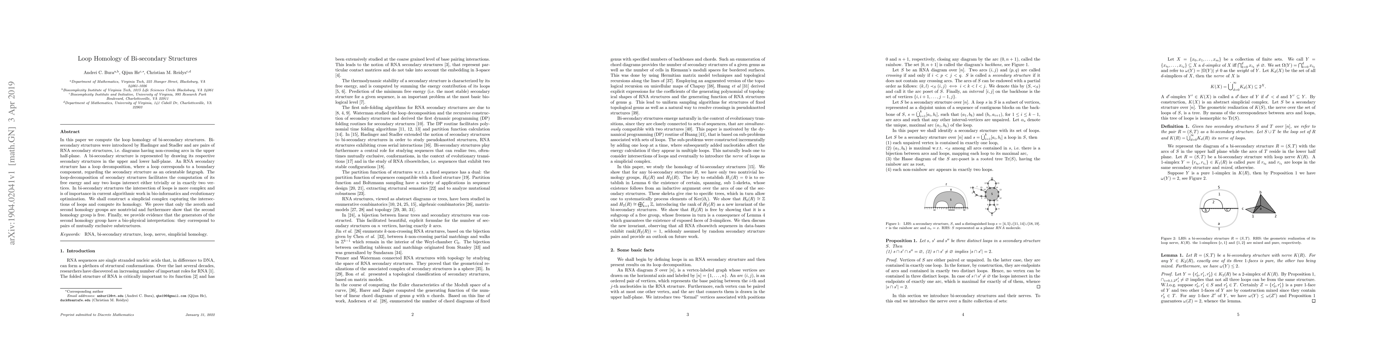 In this paper we compute the loop homology of bi-secondary structures. Bi-secondary structures were introduced by Haslinger and Stadler and are pairs of RNA secondary structures, i.e. diagrams having non-crossing arcs in the upper half-plane. A bi-secondary structure is represented by drawing its respective secondary structures in the upper and lower half-plane. An RNA secondary structure has a loop decomposition, where a loop corresponds to a boundary component, regarding the secondary structure as an orientable fatgraph. The loop-decomposition of secondary structures facilitates the computation of its free energy and any two loops intersect either trivially or in exactly two vertices. In bi-secondary structures the intersection of loops is more complex and is of importance in current algorithmic work in bio-informatics and evolutionary optimization. We shall construct a simplicial complex capturing the intersections of loops and compute its homology. We prove that only the zeroth and second homology groups are nontrivial and furthermore show that the second homology group is free. Finally, we provide evidence that the generators of the second homology group have a bio-physical interpretation: they correspond to pairs of mutually exclusive substructures.
