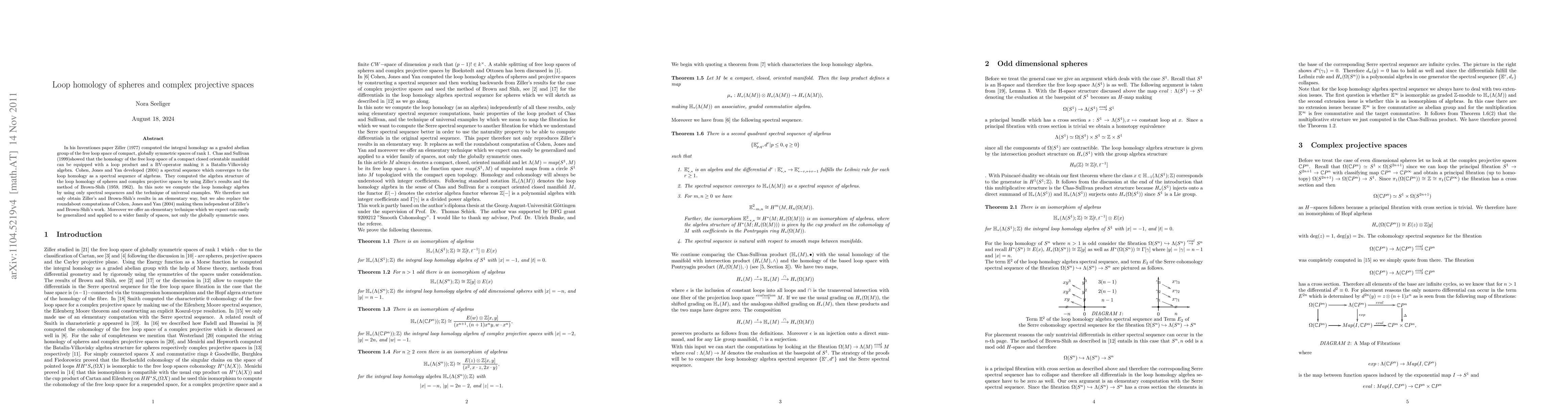 This paper computes the loop homology algebra of spheres and complex projective spaces using spectral sequences and universal examples, providing an elementary and generalized method that replaces prior computations by Cohen, Jones, and Yan, and is independent of Ziller and Brown-Shih's work.