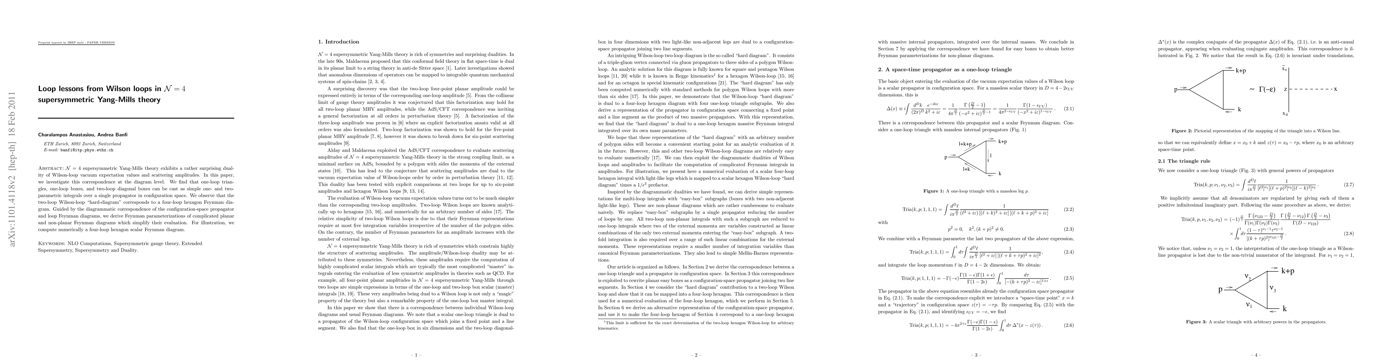 This paper explores the surprising duality between Wilson loop expectation values and scattering amplitudes in N=4 supersymmetric Yang-Mills theory, deriving simplified forms for loop integrals and Feynman diagrams through configuration-space propagators and Feynman parameterizations, ultimately computing a four-loop hexagon diagram.