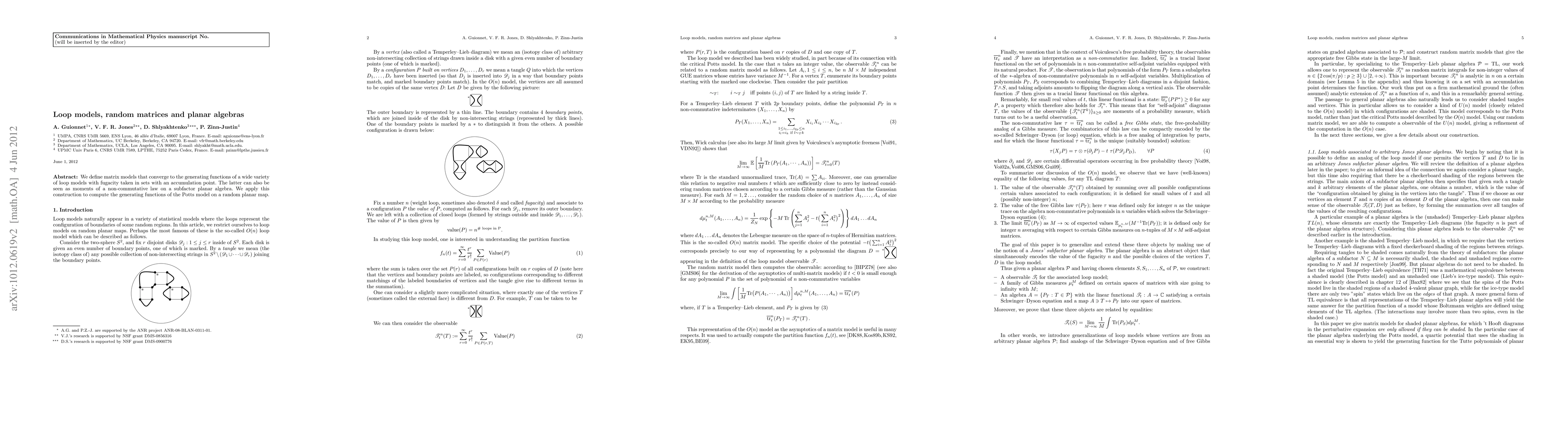 We define matrix models that converge to the generating functions of a wide variety of loop models with fugacity taken in sets with an accumulation point. The latter can also be seen as moments of a non-commutative law on a subfactor planar algebra. We apply this construction to compute the generating functions of the Potts model on a random planar map.