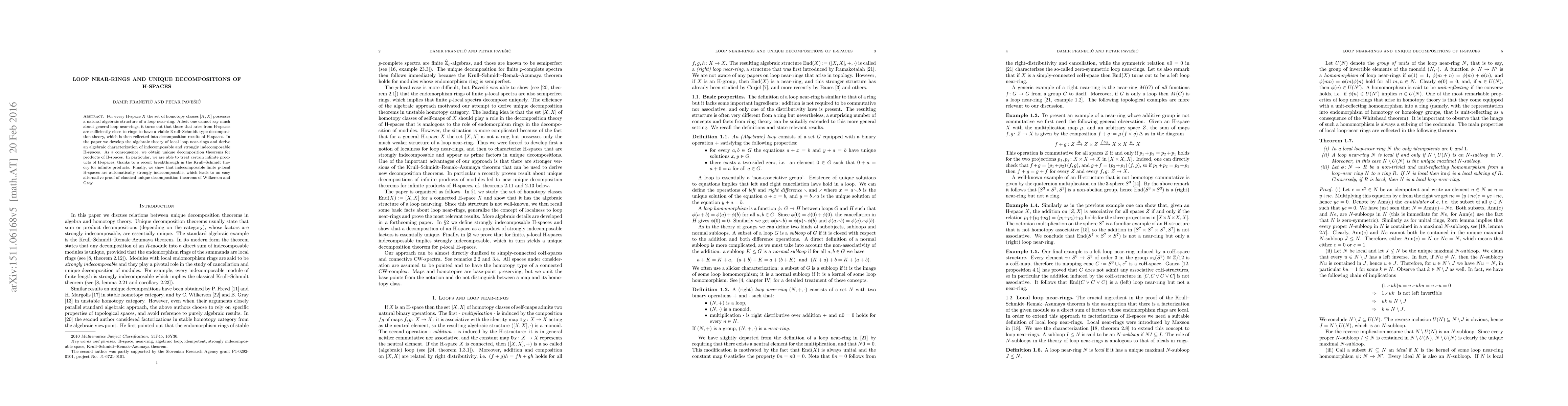 This paper develops the algebraic theory of loop near-rings from H-spaces, showing they have a Krull-Schmidt decomposition theory. It provides unique decomposition theorems for products of H-spaces, including infinite products, and proves that finite $p$-local H-spaces are strongly indecomposable.