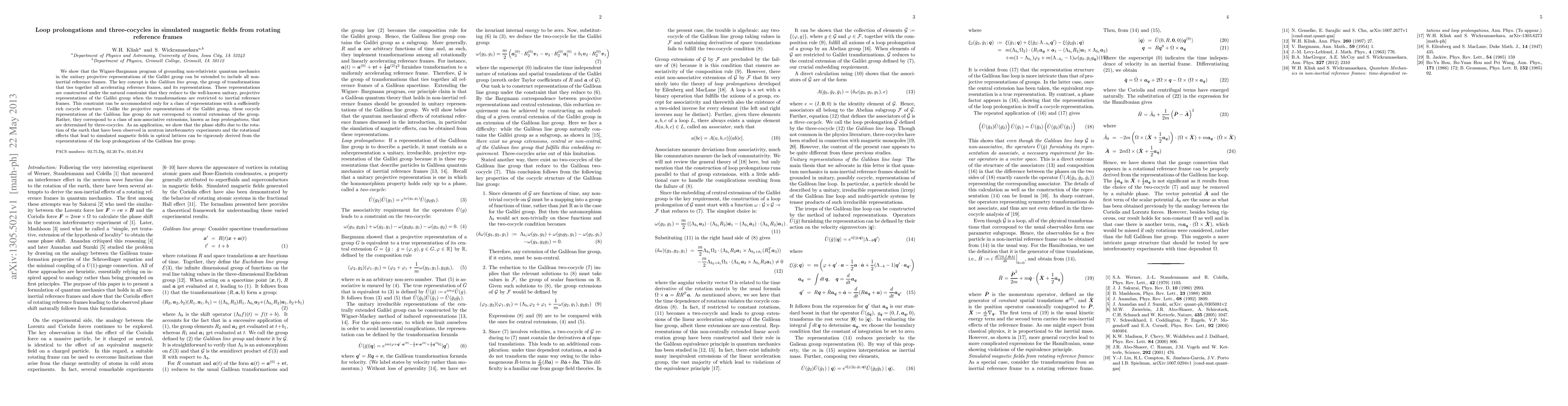 This paper extends the Wigner-Bargmann program to non-inertial reference frames using the Galilean line group, revealing loop prolongations and three-cocycles that describe phase shifts from Earth's rotation and simulated magnetic fields in optical lattices. The study introduces non-associative extensions tied to three-cocycles, providing a rigorous framework for these phenomena.