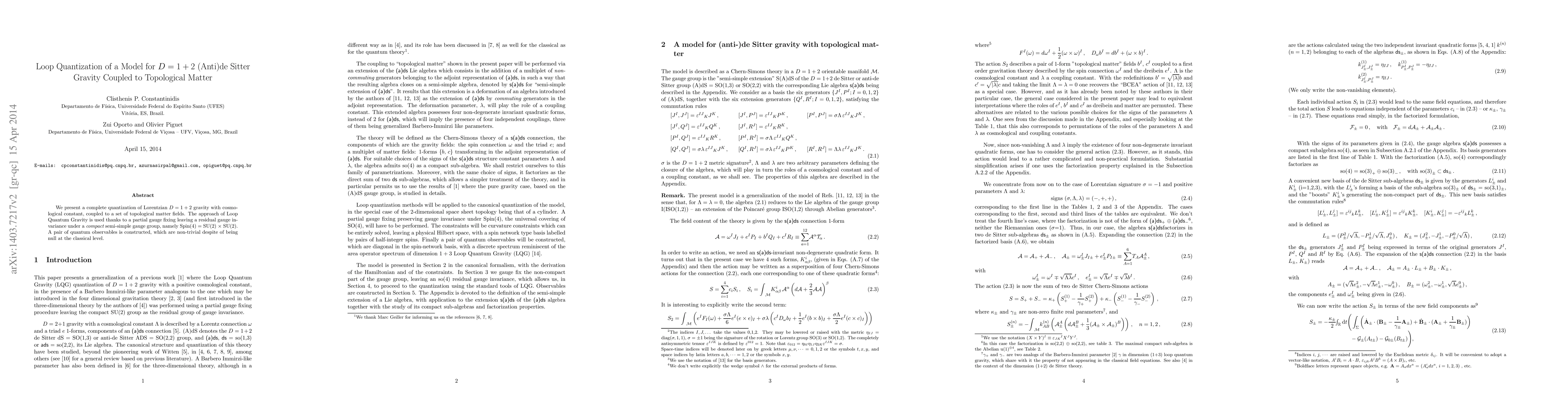 We present a complete quantization of Lorentzian D=1+2 gravity with cosmological constant, coupled to a set of topological matter fields. The approach of Loop Quantum Gravity is used thanks to a partial gauge fixing leaving a residual gauge invariance under a compact semi-simple gauge group, namely Spin(4) = SU(2) x SU(2). A pair of quantum observables is constructed, which are non-trivial despite of being null at the classical level.
