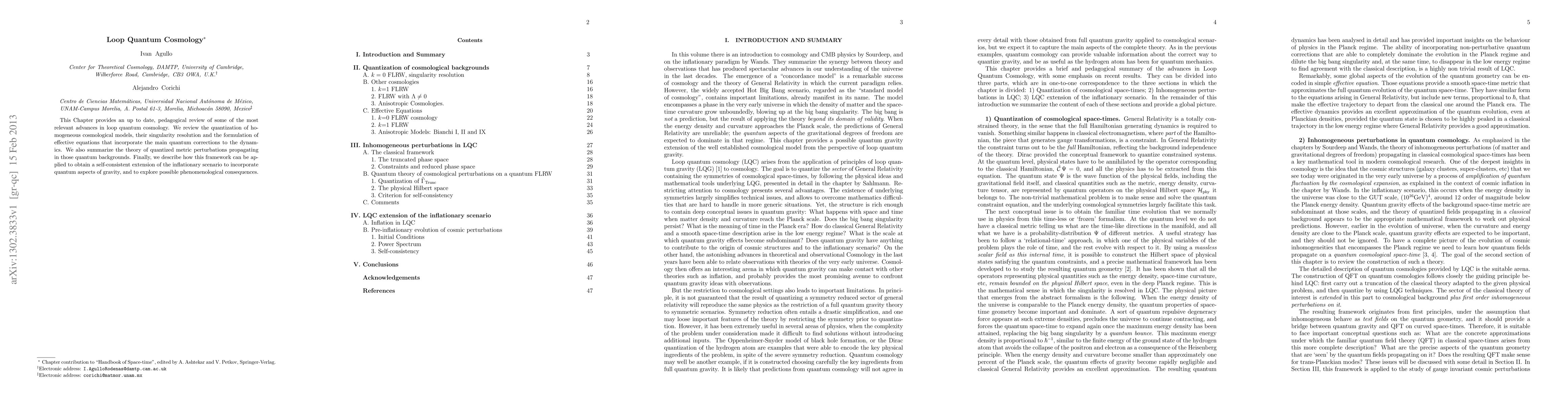 This Chapter provides an up to date, pedagogical review of some of the most relevant advances in loop quantum cosmology. We review the quantization of homogeneous cosmological models, their singularity resolution and the formulation of effective equations that incorporate the main quantum corrections to the dynamics. We also summarize the theory of quantized metric perturbations propagating in those quantum backgrounds. Finally, we describe how this framework can be applied to obtain a self-consistent extension of the inflationary scenario to incorporate quantum aspects of gravity, and to explore possible phenomenological consequences.