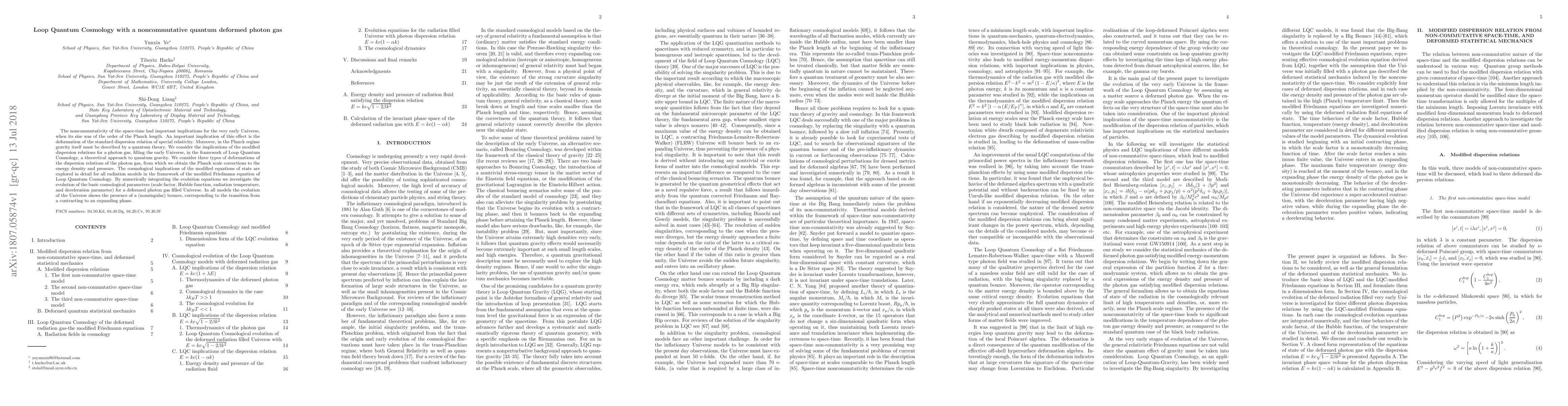 This paper explores the implications of noncommutative quantum deformation in the dispersion relation of a photon gas within the context of Loop Quantum Cosmology, revealing Planck scale corrections to energy density and pressure. It finds a nonsingular cosmological bounce in the evolution of the Universe, transitioning from contraction to expansion.