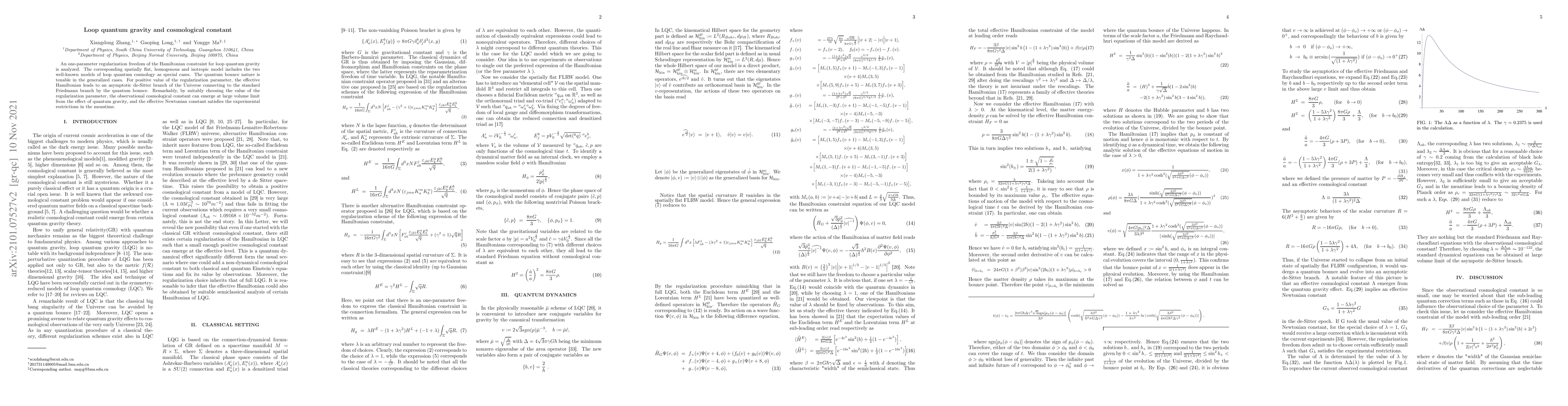 An one-parameter regularization freedom of the Hamiltonian constraint for loop quantum gravity is analyzed. The corresponding spatially flat, homogenous and isotropic model includes the two well-known models of loop quantum cosmology as special cases. The quantum bounce nature is tenable in the generalized cases. For positive value of the regularization parameter, the effective Hamiltonian leads to an asymptotic de-Sitter branch of the Universe connecting to the standard Friedmann branch by the quantum bounce. Remarkably, by suitably choosing the value of the regularization parameter, the observational cosmological constant can emerge at large volume limit from the effect of quantum gravity, and the effective Newtonian constant satisfies the experimental restrictions in the meantime.