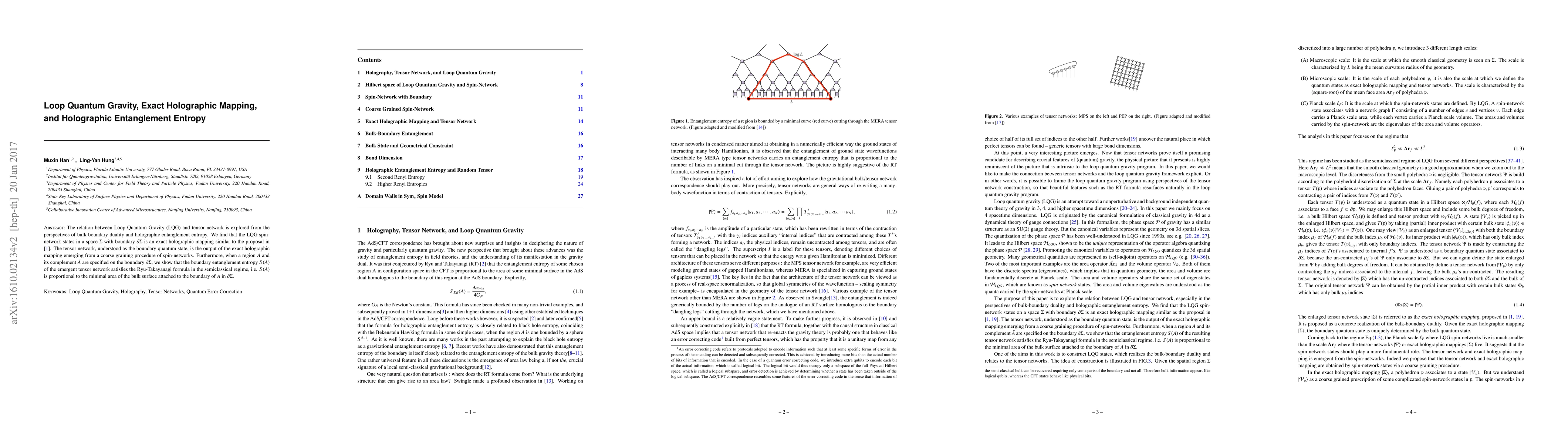 This paper investigates the connection between Loop Quantum Gravity (LQG) and tensor networks, revealing that LQG spin-network states provide an exact holographic mapping. The study shows that the boundary quantum state, represented by a tensor network, emerges from the coarse graining of spin-networks, and satisfies the Ryu-Takayanagi formula for entanglement entropy.