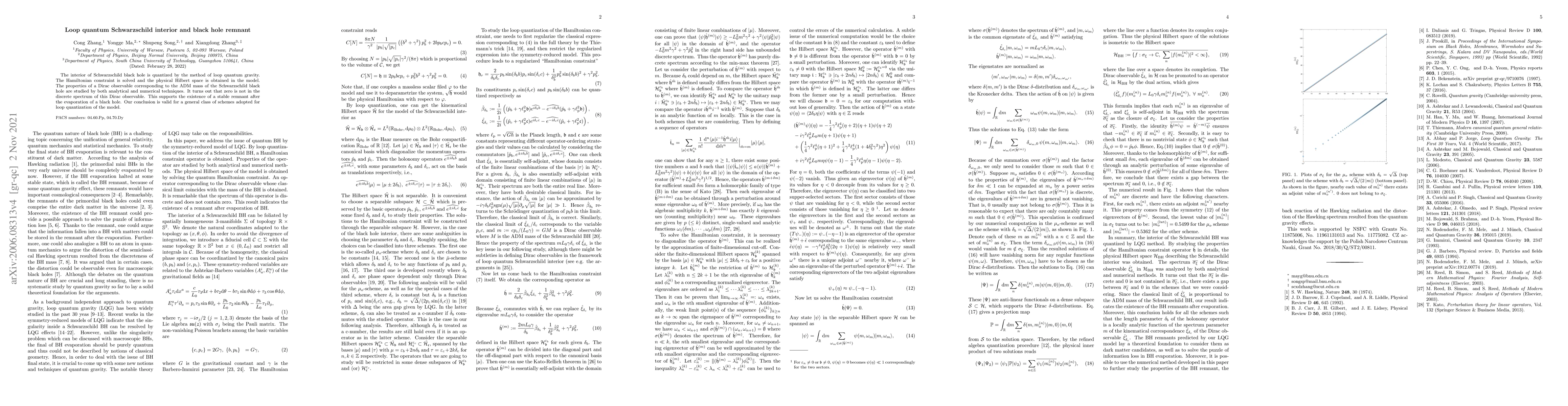 This paper explores the interior of a Schwarzschild black hole using loop quantum gravity, finding that zero is not in the spectrum of the Dirac observable corresponding to the ADM mass. This suggests the existence of a stable black hole remnant post-evaporation, applicable across various loop quantization schemes.