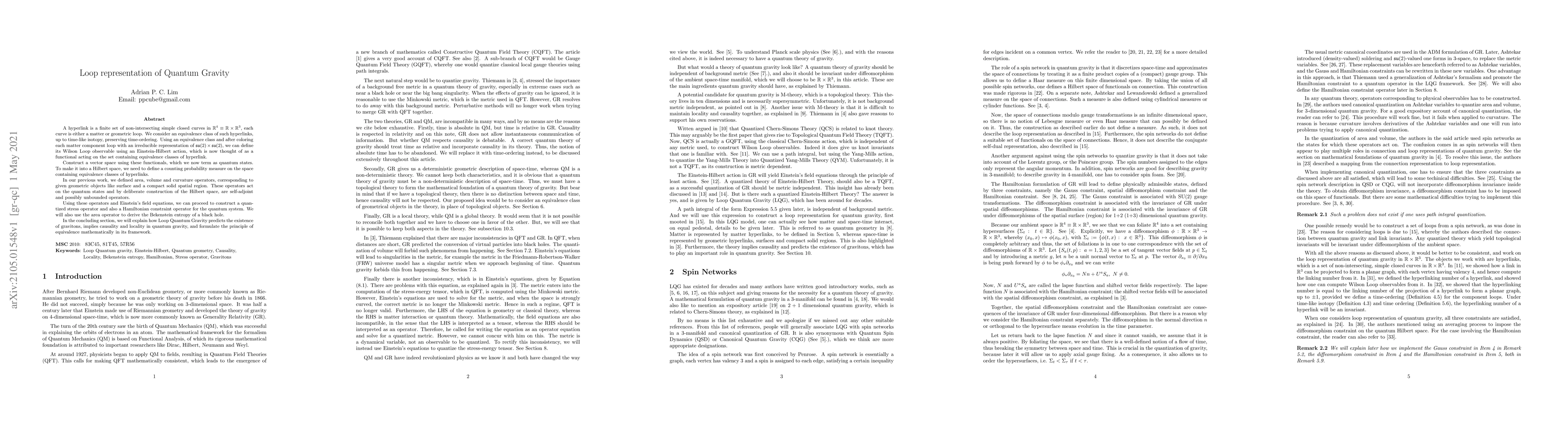 A hyperlink is a finite set of non-intersecting simple closed curves in $\mathbb{R}^4 \equiv \mathbb{R} \times \mathbb{R}^3$, each curve is either a matter or geometric loop. We consider an equivalence class of such hyperlinks, up to time-like isotopy, preserving time-ordering. Using an equivalence class and after coloring each matter component loop with an irreducible representation of $\mathfrak{su}(2) \times \mathfrak{su}(2)$, we can define its Wilson Loop observable using an Einstein-Hilbert action, which is now thought of as a functional acting on the set containing equivalence classes of hyperlink. Construct a vector space using these functionals, which we now term as quantum states. To make it into a Hilbert space, we need to define a counting probability measure on the space containing equivalence classes of hyperlinks. In our previous work, we defined area, volume and curvature operators, corresponding to given geometric objects like surface and a compact solid spatial region. These operators act on the quantum states and by deliberate construction of the Hilbert space, are self-adjoint and possibly unbounded operators. Using these operators and Einstein's field equations, we can proceed to construct a quantized stress operator and also a Hamiltonian constraint operator for the quantum system. We will also use the area operator to derive the Bekenstein entropy of a black hole. In the concluding section, we will explain how Loop Quantum Gravity predicts the existence of gravitons, implies causality and locality in quantum gravity, and formulate the principle of equivalence mathematically in its framework.