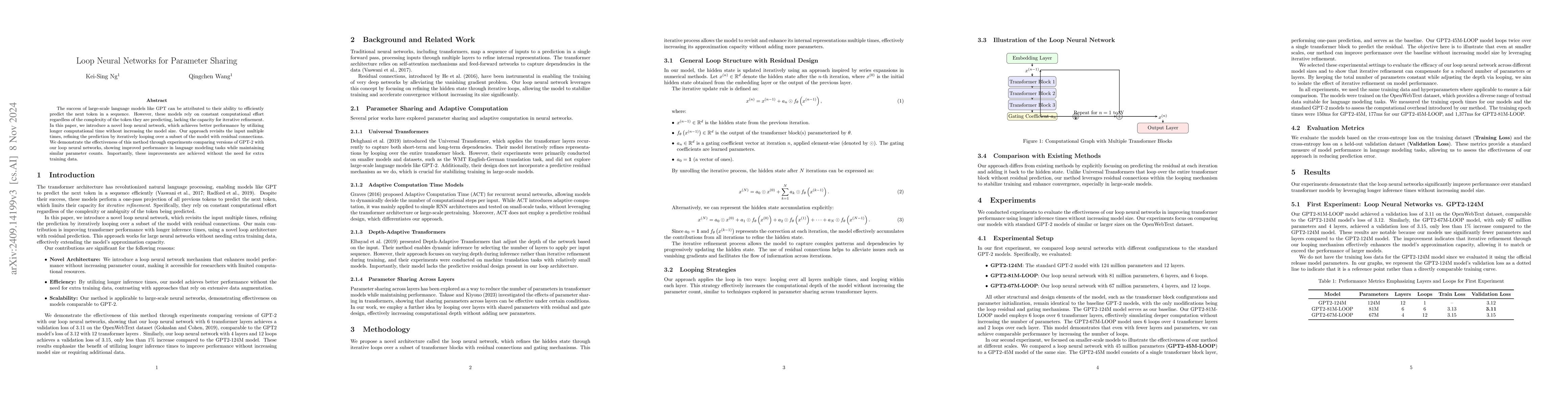 The success of large-scale language models like GPT can be attributed to their ability to efficiently predict the next token in a sequence. However, these models rely on constant computational effort regardless of the complexity of the token they are predicting, lacking the capacity for iterative refinement. In this paper, we introduce a novel Loop-Residual Neural Network, which achieves better performance by utilizing longer computational time without increasing the model size. Our approach revisits the input multiple times, refining the prediction by iteratively looping over a subset of the model with residual connections. We demonstrate the effectiveness of this method through experiments comparing versions of GPT-2 with our Loop-Residual models, showing improved performance in language modeling tasks while maintaining similar parameter counts. Importantly, these improvements are achieved without the need for extra training data.