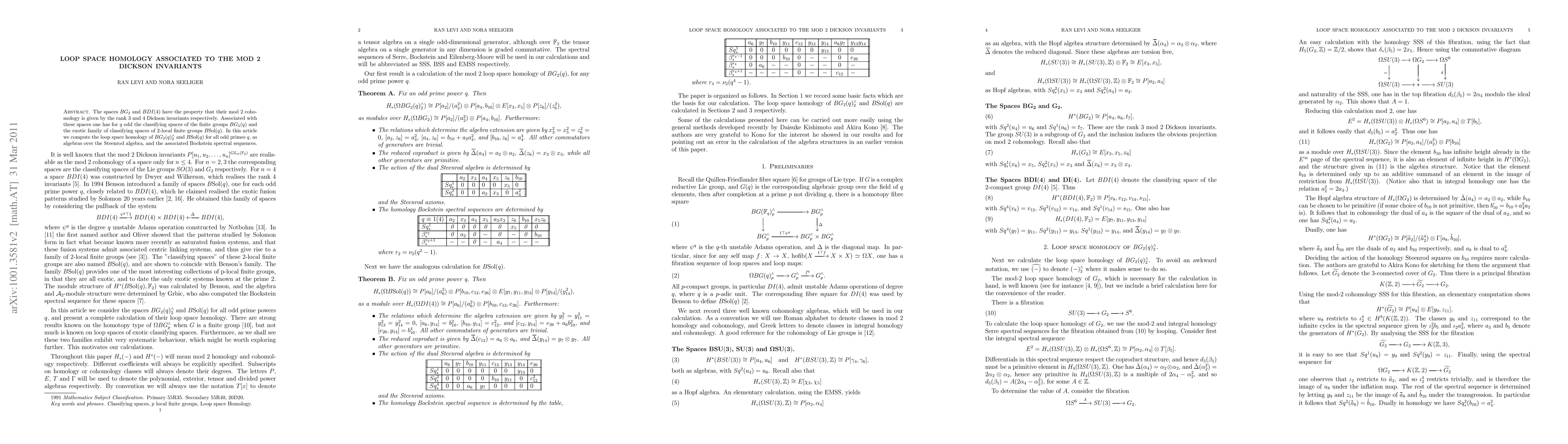 The spaces BG_2 and BDI(4) have the property that their mod 2 cohomology is given by the rank 3 and 4 Dickson invariants respectively. Associated with these spaces one has for q odd the classifying spaces of the finite groups BG_2(q)and the exotic family of classifying spaces of 2-local finite groups BSol(q). In this article compute the mod 2 loop space homology of the 2-completed classifying space of G_2(q) and of BSol(q) for all odd primes q, as algebras over the Steenrod algebra, and the associated Bockstein spectral sequences.