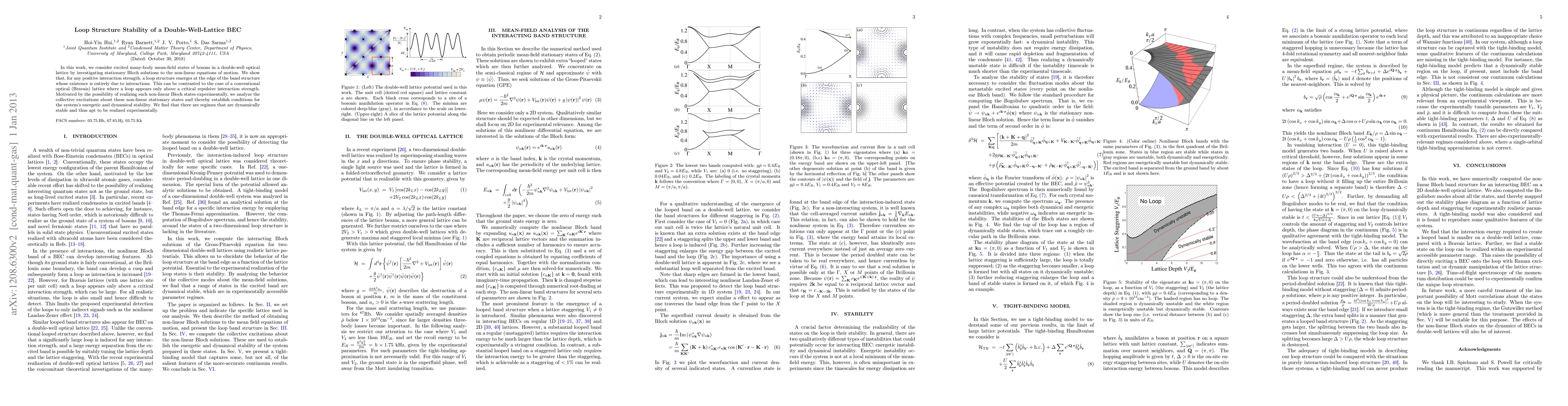 In this work, we consider excited many-body mean-field states of bosons in a double-well optical lattice by investigating stationary Bloch solutions to the non-linear equations of motion. We show that, for any positive interaction strength, a loop structure emerges at the edge of the band structure whose existence is entirely due to interactions. This can be contrasted to the case of a conventional optical (Bravais) lattice where a loop appears only above a critical repulsive interaction strength. Motivated by the possibility of realizing such non-linear Bloch states experimentally, we analyze the collective excitations about these non-linear stationary states and thereby establish conditions for the system's energetic and dynamical stability. We find that there are regimes that are dynamically stable and thus apt to be realized experimentally.