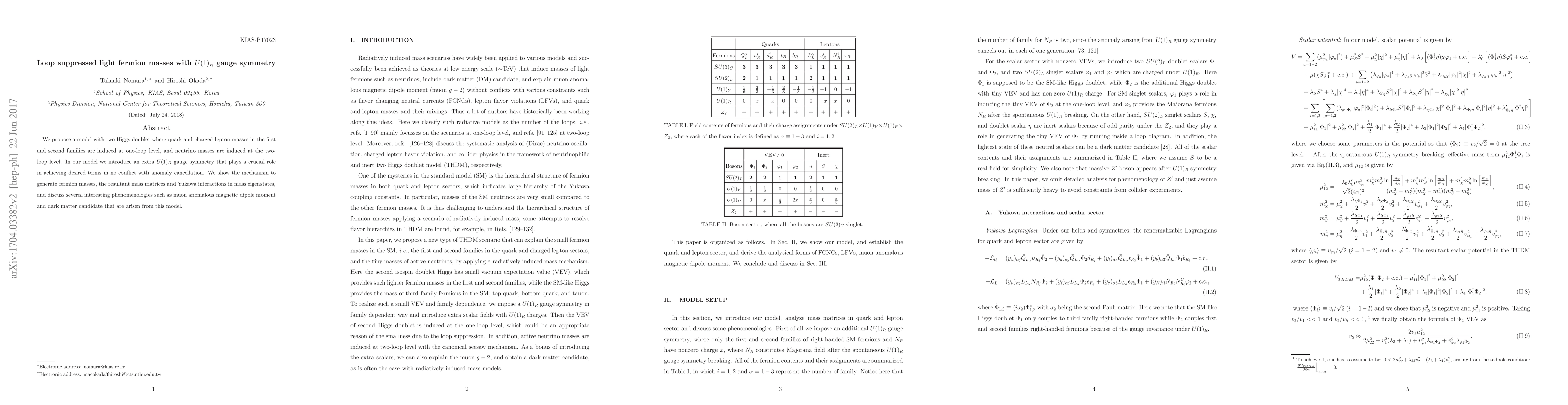 This paper proposes a model with two Higgs doublets and a $U(1)_R$ gauge symmetry to generate one-loop quark and charged-lepton masses and two-loop neutrino masses, while avoiding anomalies. It discusses the resulting mass matrices, Yukawa interactions, and potential phenomenology including the muon anomalous magnetic dipole moment and dark matter candidates.