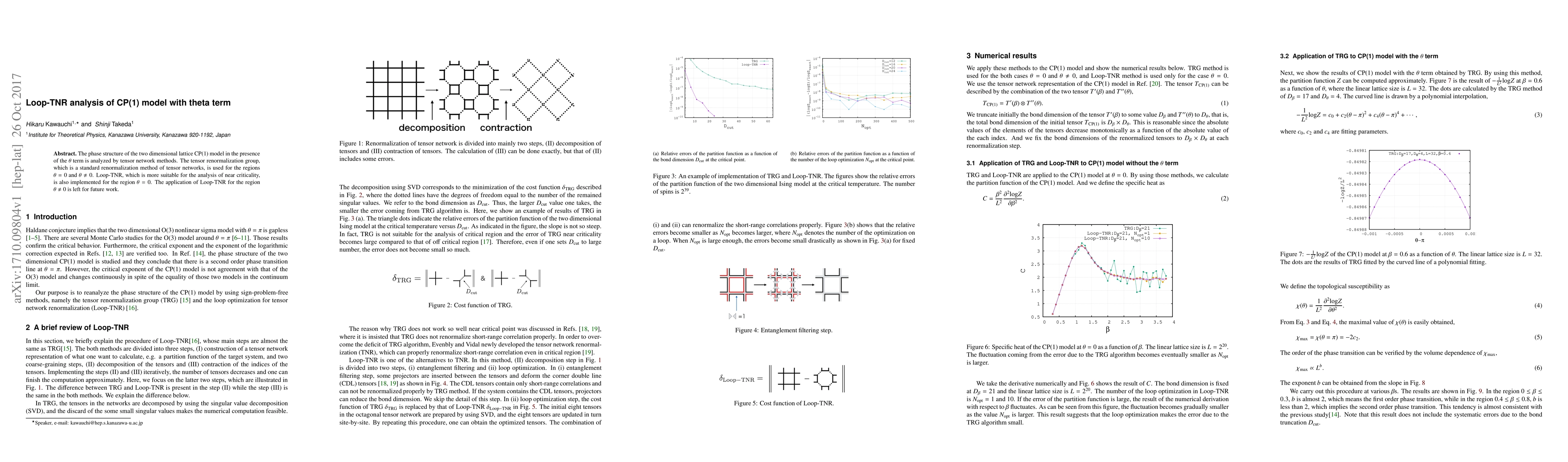 This paper analyzes the phase structure of the CP(1) model with a theta term on a two-dimensional lattice using tensor network methods, employing the tensor renormalization group for $\theta = 0$ and $\theta \neq 0$, and Loop-TNR for near criticality in the $\theta = 0$ region. The application of Loop-TNR for $\theta \neq 0$ is proposed for future research.