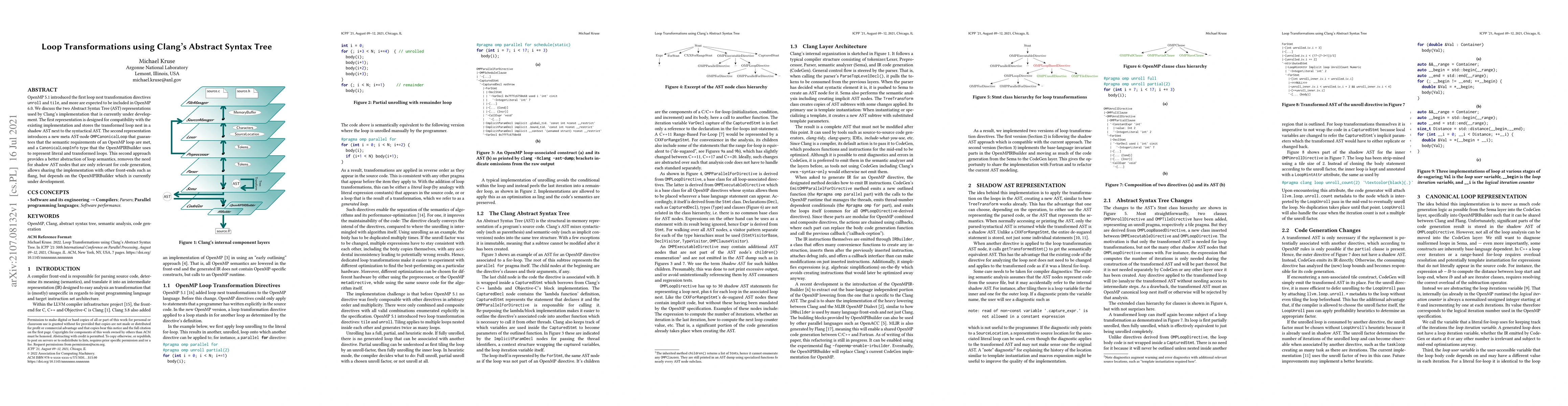 This paper discusses Clang's implementation of loop transformation directives in OpenMP 5.1 using two Abstract Syntax Tree (AST) representations. The first representation maintains compatibility with existing implementations using a shadow AST, while the second introduces a new meta AST-node OMPCanonicalLoop for better abstraction and sharing with other front-ends, though it depends on the under-development OpenMPIRBuilder.