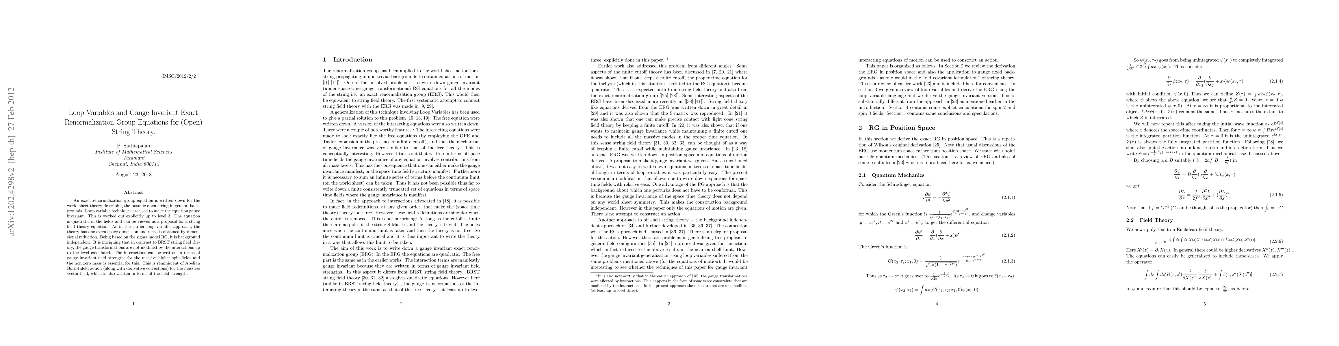 An exact renormalization group equation is written down for the world sheet theory describing the bosonic open string in general backgrounds. Loop variable techniques are used to make the equation gauge invariant. This is worked out explicitly up to level 3. The equation is quadratic in the fields and can be viewed as a proposal for a string field theory equation. As in the earlier loop variable approach, the theory has one extra space dimension and mass is obtained by dimensional reduction. Being based on the sigma model RG, it is background independent. It is intriguing that in contrast to BRST string field theory, the gauge transformations are not modified by the interactions up to the level calculated. The interactions can be written in terms of gauge invariant field strengths for the massive higher spin fields and the non zero mass is essential for this. This is reminiscent of Abelian Born-Infeld action (along with derivative corrections) for the massless vector field, which is also written in terms of the field strength.