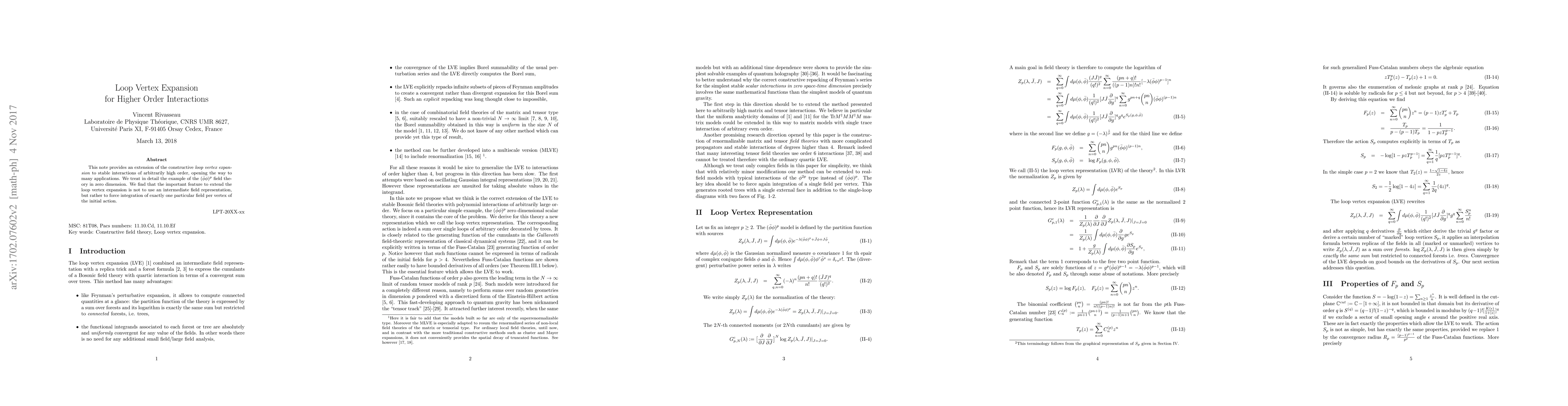 This paper extends the loop vertex expansion to stable interactions of any order, focusing on the $(\bar \phi \phi)^p$ field theory in zero dimension. The key innovation is integrating exactly one field per vertex, rather than using an intermediate field representation.