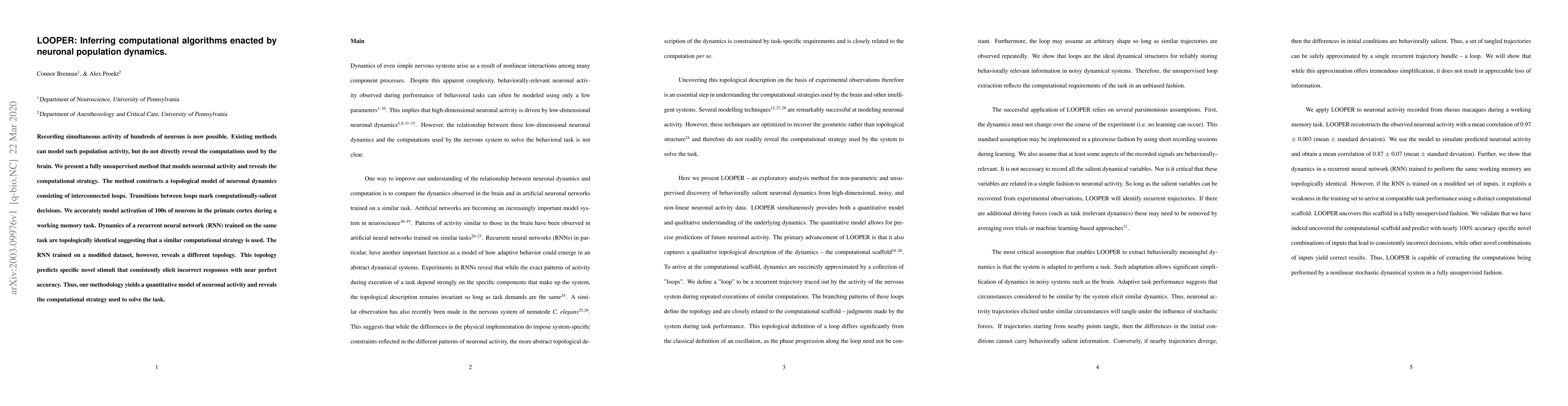 Recording simultaneous activity of hundreds of neurons is now possible. Existing methods can model such population activity, but do not directly reveal the computations used by the brain. We present a fully unsupervised method that models neuronal activity and reveals the computational strategy. The method constructs a topological model of neuronal dynamics consisting of interconnected loops. Transitions between loops mark computationally-salient decisions. We accurately model activation of 100s of neurons in the primate cortex during a working memory task. Dynamics of a recurrent neural network (RNN) trained on the same task are topologically identical suggesting that a similar computational strategy is used. The RNN trained on a modified dataset, however, reveals a different topology. This topology predicts specific novel stimuli that consistently elicit incorrect responses with near perfect accuracy. Thus, our methodology yields a quantitative model of neuronal activity and reveals the computational strategy used to solve the task.
