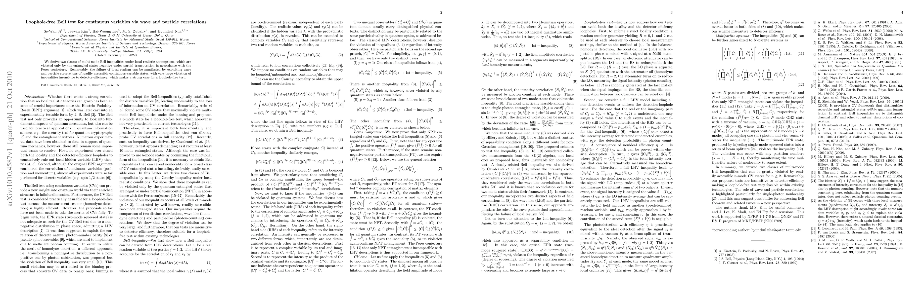 This paper presents two classes of multi-mode Bell inequalities that are violated by entangled states, supporting the Peres conjecture. The study demonstrates that wave and particle correlations in continuous-variable states can reveal the failure of local realism in a loophole-free manner, with significant inequality violations that are detector-efficiency independent.