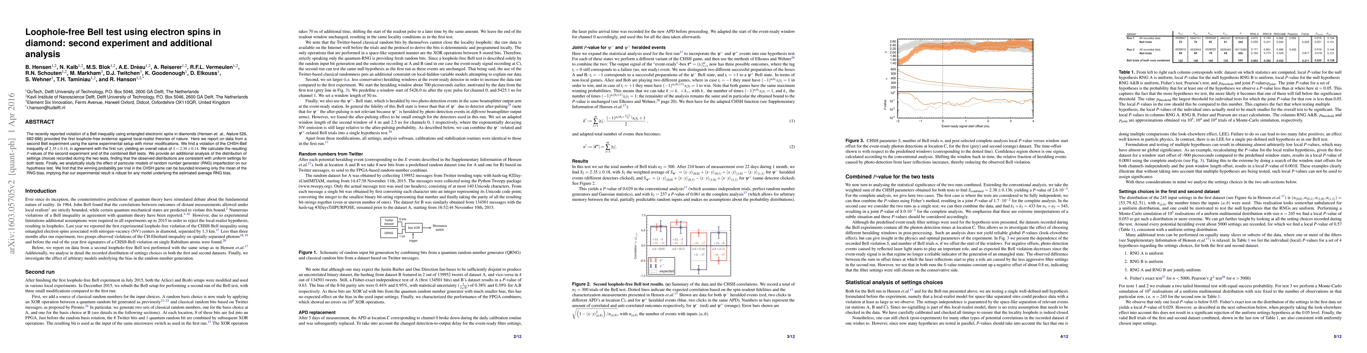 This paper reports a second loophole-free Bell test using electron spins in diamonds, confirming the first experiment's violation of the CHSH-Bell inequality with a combined value of $S = 2.38 \pm 0.14$. The study also analyzes the uniformity of settings and the robustness of results against random number generator imperfections.