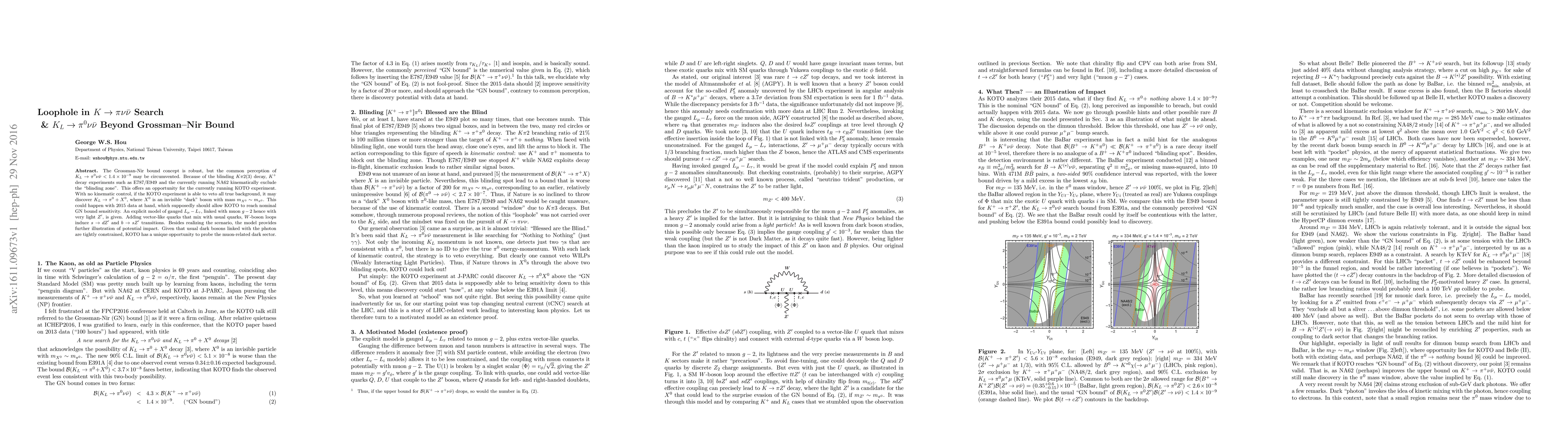 The Grossman-Nir bound concept is robust, but the common perception of $K_L \to \pi^0\nu\bar\nu < 1.4 \times 10^{-9}$ may be circumvented. Because of the blinding $K\pi2$(3) decay, $K^+$ decay experiments such as E787/E949 and the currently running NA62 kinematically exclude the "blinding zone". This offers an opportunity for the currently running KOTO experiment. With no kinematic control, if the KOTO experiment is able to veto all true background, it may discover $K_L \to \pi^0 + X^0$, where $X^0$ is an invisible "dark" boson with mass $m_{X^0} \sim m_{\pi^0}$. This could happen with 2015 data at hand, which supposedly should allow KOTO to reach nominal GN bound sensitivity. An explicit model of gauged $L_\mu - L_\tau$, linked with muon $g-2$ hence with very light $Z'$, is given. Adding vector-like quarks that mix with usual quarks, $W$-boson loops induce $s\to dZ'$ and $b\to sZ'$ transitions. Besides realizing the scenario, the model provides further illustration of potential impact. Given that usual dark bosons linked with the photon are tightly constrained, KOTO has a unique opportunity to probe the muon-related dark sector.