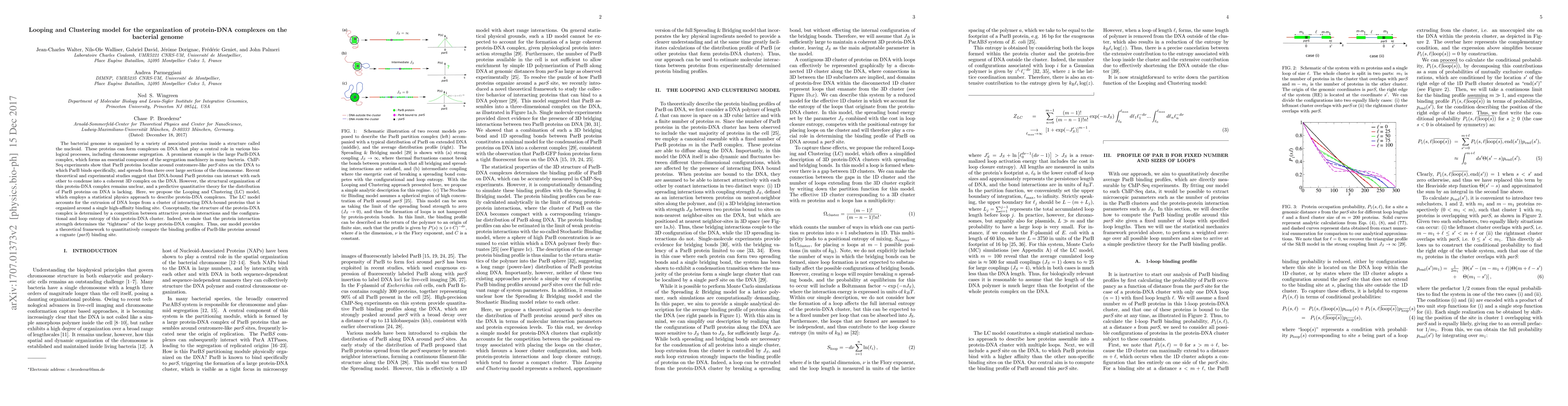 The Looping and Clustering (LC) model proposes a statistical physics approach to describe the organization of protein-DNA complexes in bacterial genomes, focusing on the interaction between ParB proteins and DNA. The model predicts the distribution of ParB proteins around high-affinity binding sites by balancing protein interactions and loop entropy.
