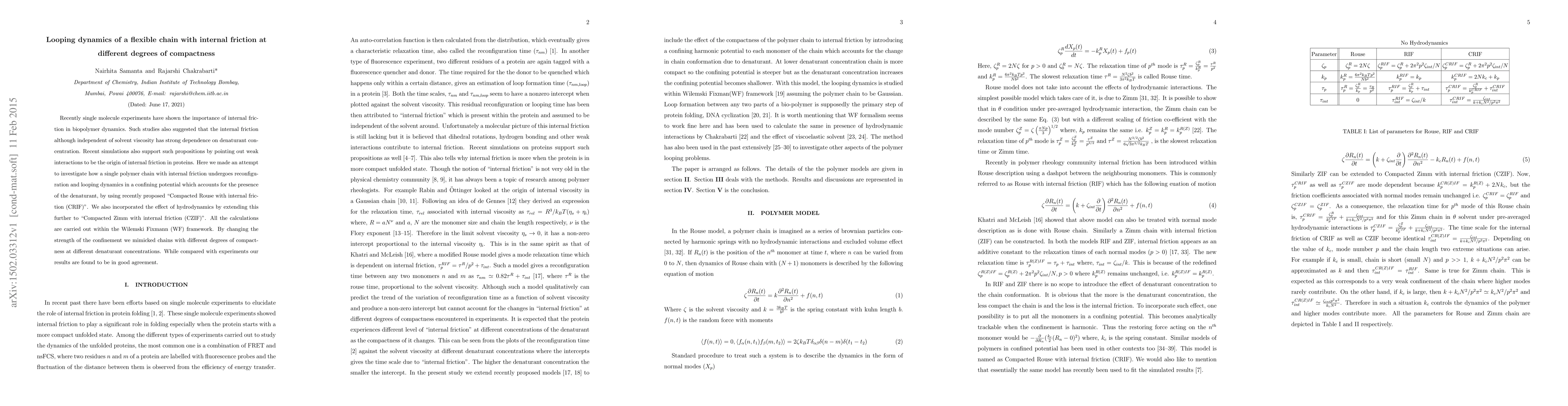 This paper investigates the looping dynamics of a flexible polymer chain with internal friction under varying degrees of compactness, using simulations based on the Compacted Rouse and Compacted Zimm models within the Wilemski Fixmann framework. The study finds good agreement with experimental observations and highlights the influence of denaturant concentration on internal friction.