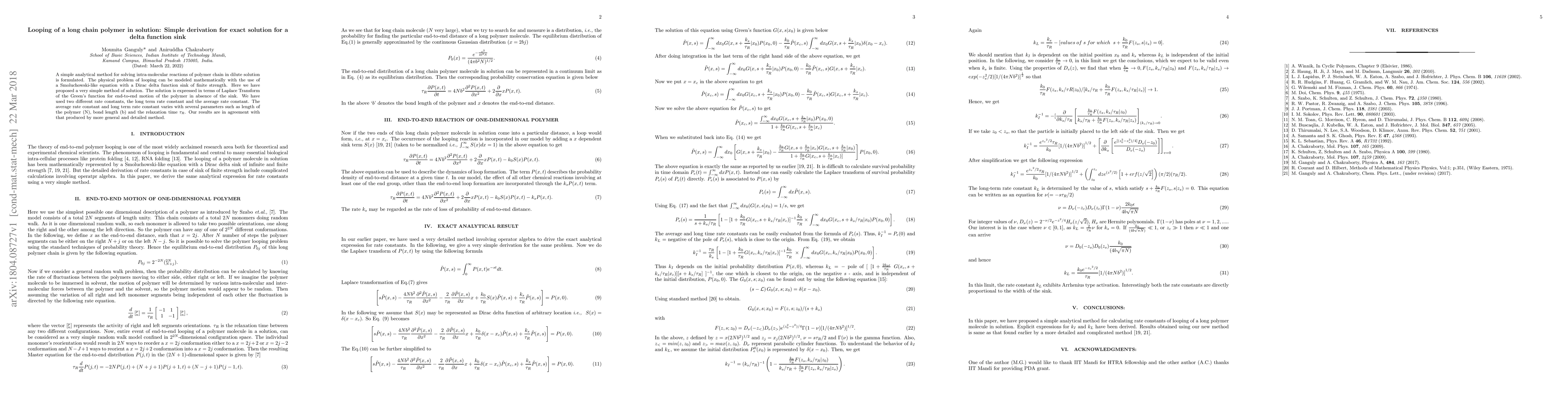 A simple analytical method for solving intra-molecular reactions of polymer chain in dilute solution is formulated. The physical problem of looping can be modeled mathematically with the use of a Smoluchowski-like equation with a Dirac delta function sink of finite strength. Here we have proposed a very simple method of solution. The solution is expressed in terms of Laplace Transform of the Green's function for end-to-end motion of the polymer in absence of the sink. We have used two different rate constants, the long term rate constant and the average rate constant. The average rate constant and long term rate constant varies with several parameters such as length of the polymer (N), bond length (b) and the relaxation time ${\tau_R}$. Our results are in agreement with that produced by more general and detailed method.