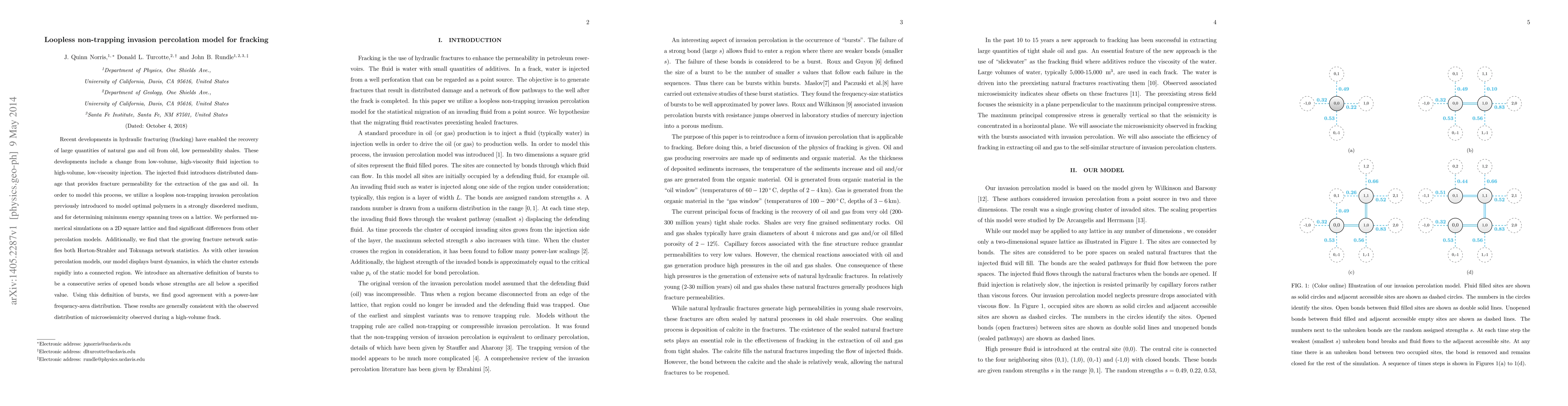 This paper proposes a loopless non-trapping invasion percolation model to simulate the fracture network growth in hydraulic fracturing, showing significant differences from traditional percolation models and aligning well with observed microseismicity patterns. The model's burst dynamics and frequency-area distribution match empirical data from high-volume fracking operations.