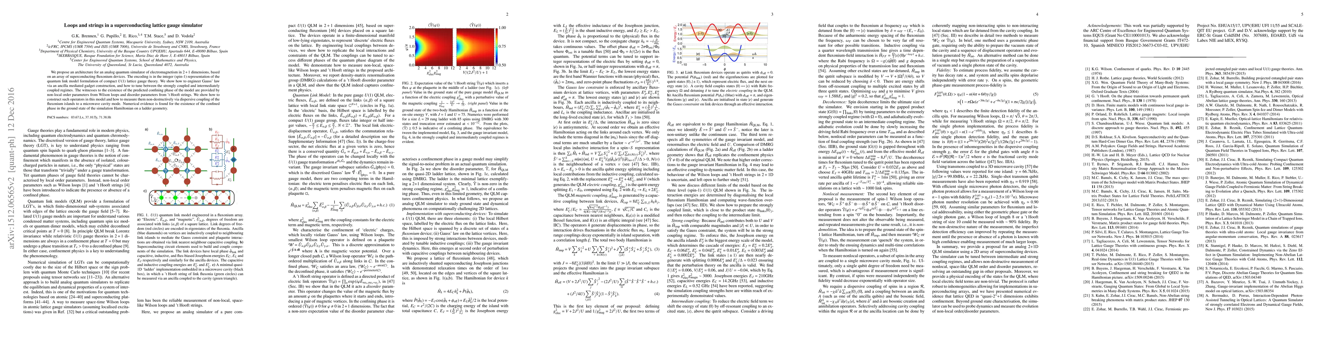 This paper proposes a superconducting lattice gauge simulator using fluxonium devices to model electromagnetism in 2+1 dimensions, demonstrating the engineering of Gauss' law and the ability to measure nonlocal order parameters via a microwave cavity. Numerical evidence supports the existence of a predicted confining phase in the simulation.