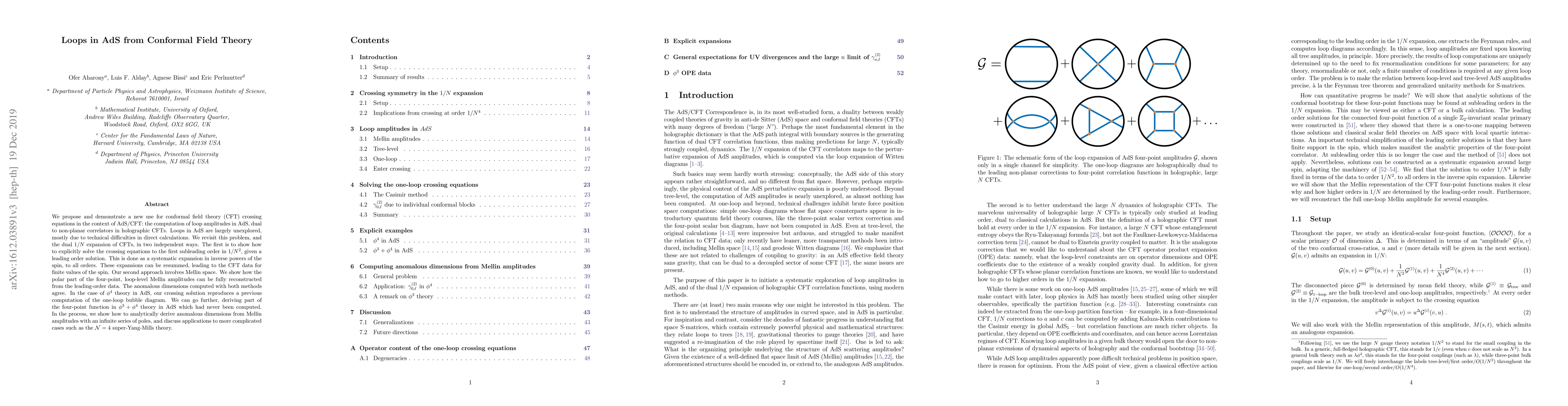 We propose and demonstrate a new use for conformal field theory (CFT) crossing equations in the context of AdS/CFT: the computation of loop amplitudes in AdS, dual to non-planar correlators in holographic CFTs. Loops in AdS are largely unexplored, mostly due to technical difficulties in direct calculations. We revisit this problem, and the dual $1/N$ expansion of CFTs, in two independent ways. The first is to show how to explicitly solve the crossing equations to the first subleading order in $1/N^2$, given a leading order solution. This is done as a systematic expansion in inverse powers of the spin, to all orders. These expansions can be resummed, leading to the CFT data for finite values of the spin. Our second approach involves Mellin space. We show how the polar part of the four-point, loop-level Mellin amplitudes can be fully reconstructed from the leading-order data. The anomalous dimensions computed with both methods agree. In the case of $\phi^4$ theory in AdS, our crossing solution reproduces a previous computation of the one-loop bubble diagram. We can go further, deriving part of the four-point function in $\phi^3+\phi^4$ theory in AdS which had never been computed. In the process, we show how to analytically derive anomalous dimensions from Mellin amplitudes with an infinite series of poles, and discuss applications to more complicated cases such as the ${\cal N}=4$ super-Yang-Mills theory.