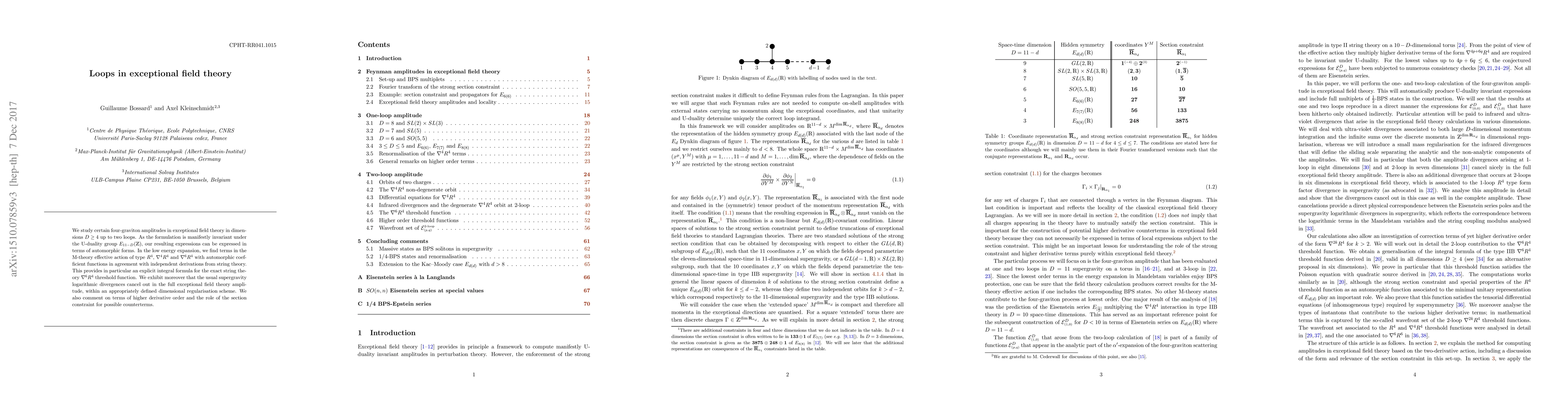 We study certain four-graviton amplitudes in exceptional field theory in dimensions $D\geq 4$ up to two loops. As the formulation is manifestly invariant under the U-duality group $E_{11-D}(\mathbb{Z})$, our resulting expressions can be expressed in terms of automorphic forms. In the low energy expansion, we find terms in the M-theory effective action of type $R^4$, $\nabla^4R^4$ and $\nabla^6 R^4$ with automorphic coefficient functions in agreement with independent derivations from string theory. This provides in particular an explicit integral formula for the exact string theory $\nabla^6 R^4$ threshold function. We exhibit moreover that the usual supergravity logarithmic divergences cancel out in the full exceptional field theory amplitude, within an appropriately defined dimensional regularisation scheme. We also comment on terms of higher derivative order and the role of the section constraint for possible counterterms.