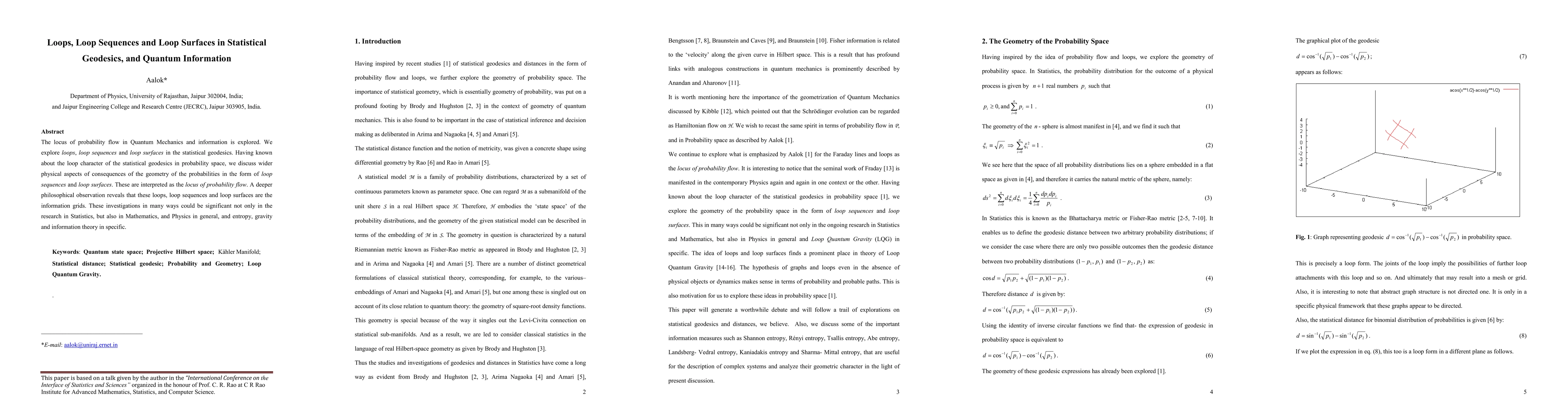 This paper explores the geometric structures of loops, loop sequences, and loop surfaces in statistical geodesics within Quantum Mechanics and information theory, interpreting them as the locus of probability flow and information grids. The findings have implications for Statistics, Mathematics, and Physics, particularly in entropy, gravity, and information theory.