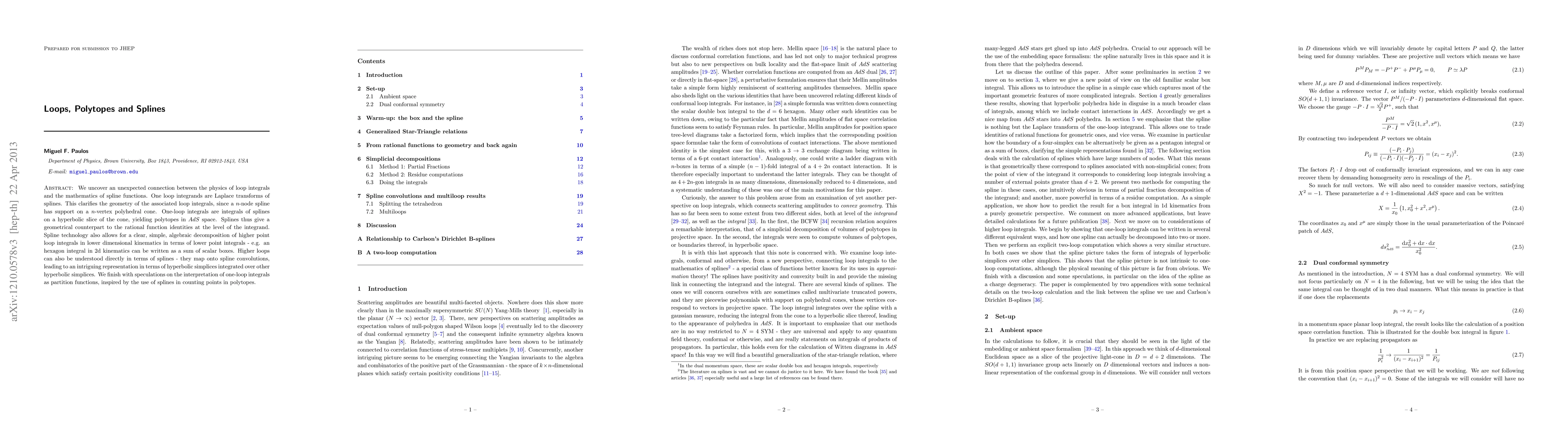 We uncover an unexpected connection between the physics of loop integrals and the mathematics of spline functions. One loop integrands are Laplace transforms of splines. This clarifies the geometry of the associated loop integrals, since a $n$-node spline has support on an $n$-vertex polyhedral cone. One-loop integrals are integrals of splines on a hyperbolic slice of the cone, yielding polytopes in $AdS$ space. Splines thus give a geometrical counterpart to the rational function identities at the level of the integrand. Spline technology also allows for a clear, simple, algebraic decomposition of higher point loop integrals in lower dimensional kinematics in terms of lower point integrals - e.g. an hexagon integral in 2d kinematics can be written as a sum of scalar boxes. Higher loops can also be understood directly in terms of splines - they map onto spline convolutions, leading to an intriguing representation in terms of hyperbolic simplices integrated over other hyperbolic simplices. We finish with speculations on the interpretation of one-loop integrals as partition functions, inspired by the use of splines in counting points in polytopes.