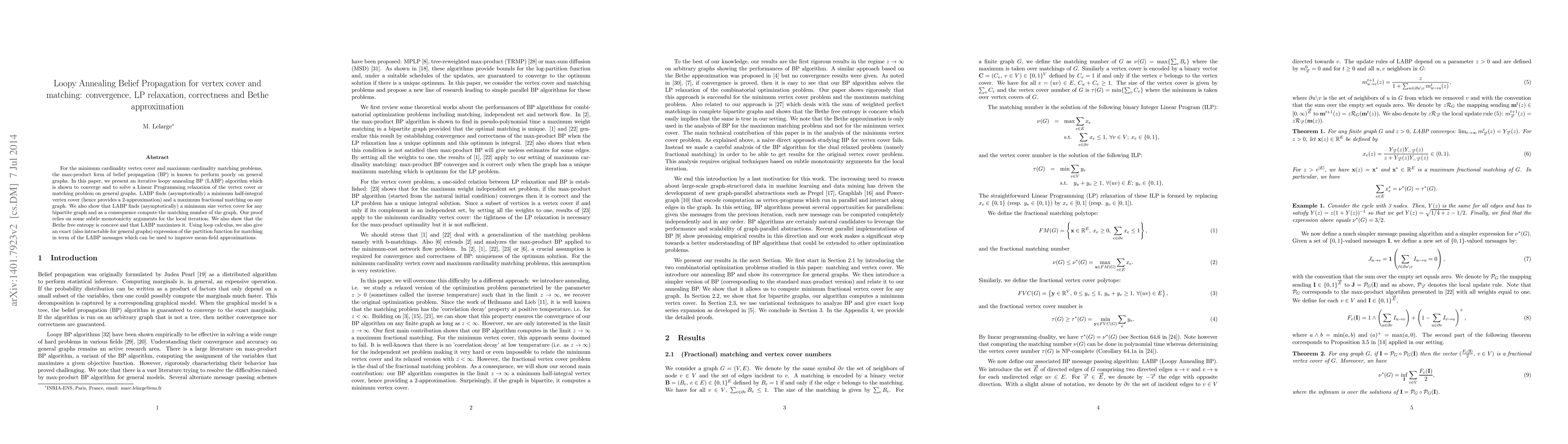 This paper introduces a loopy annealing belief propagation (LABP) algorithm for solving minimum vertex cover and maximum matching problems, demonstrating its convergence and ability to solve linear programming relaxations. LABP provides a 2-approximation for vertex cover and computes the matching number for bipartite graphs, leveraging monotonicity arguments and maximizing the Bethe free entropy.