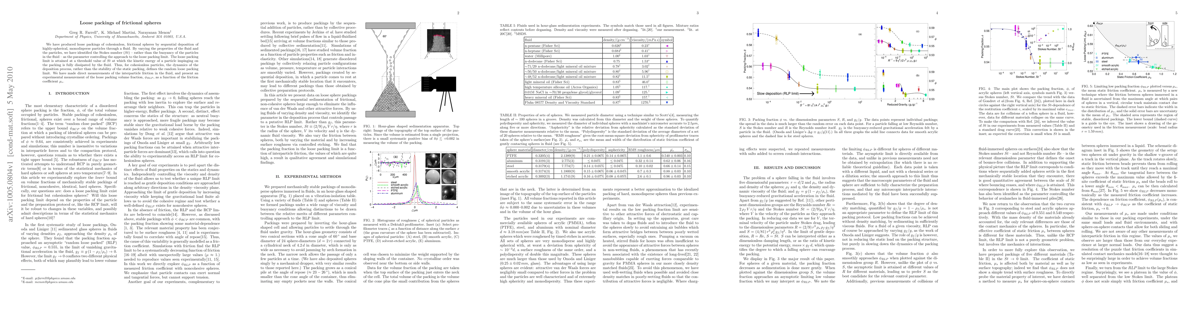 Researchers created loose packings of frictional spheres using a fluid, finding that the Stokes number controls the approach to the loose packing limit, which is determined by the dynamics of deposition rather than static stability. They also measured the interparticle friction and presented an experimental measurement of the loose packing volume fraction as a function of the friction coefficient.