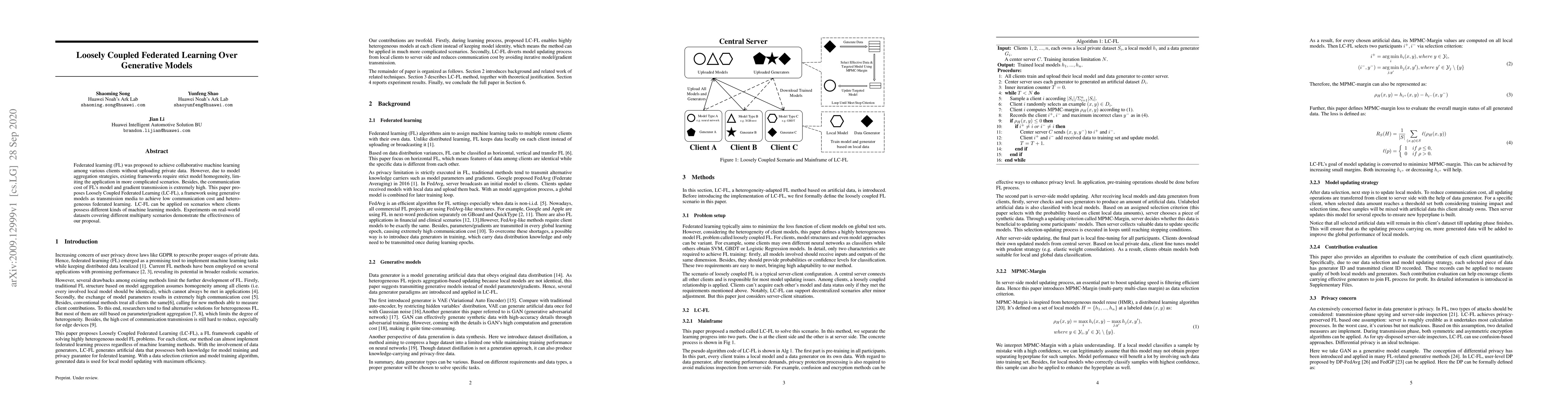 This paper introduces Loosely Coupled Federated Learning (LC-FL), a framework that leverages generative models to reduce communication costs and enable heterogeneous federated learning among clients with diverse machine learning models, demonstrating effectiveness through experiments on various multiparty scenarios.