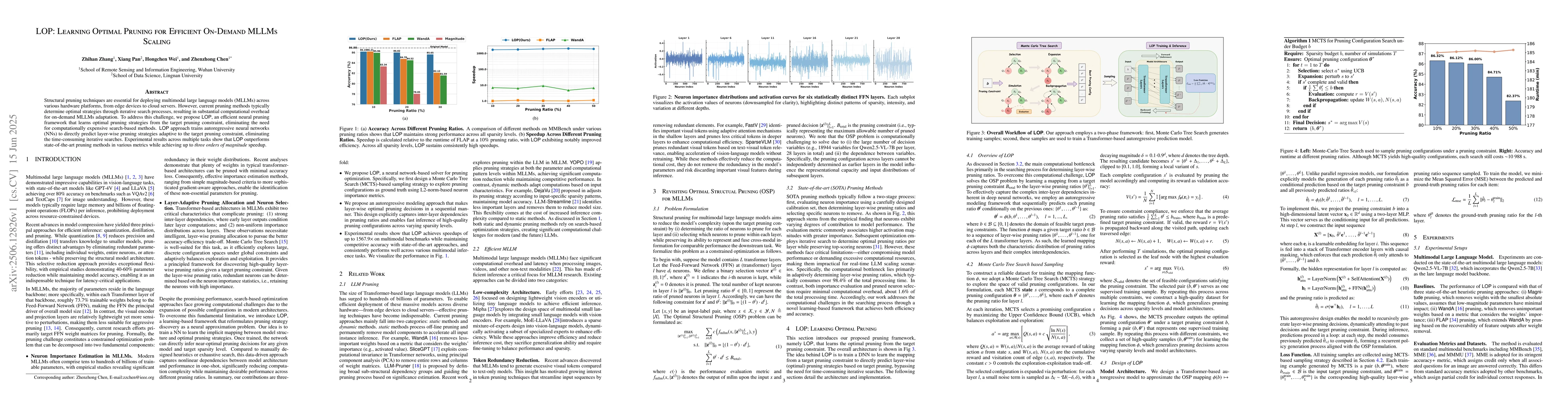 The research introduces LOP, a neural pruning framework for multimodal large language models (MLLMs) that learns optimal pruning strategies from target pruning constraints, eliminating the need for computationally expensive search-based methods. LOP employs a two-phase framework: Monte Carlo Tree Search (MCTS) for generating training samples, and a Transformer-based autoregressive prediction model trained on these samples.