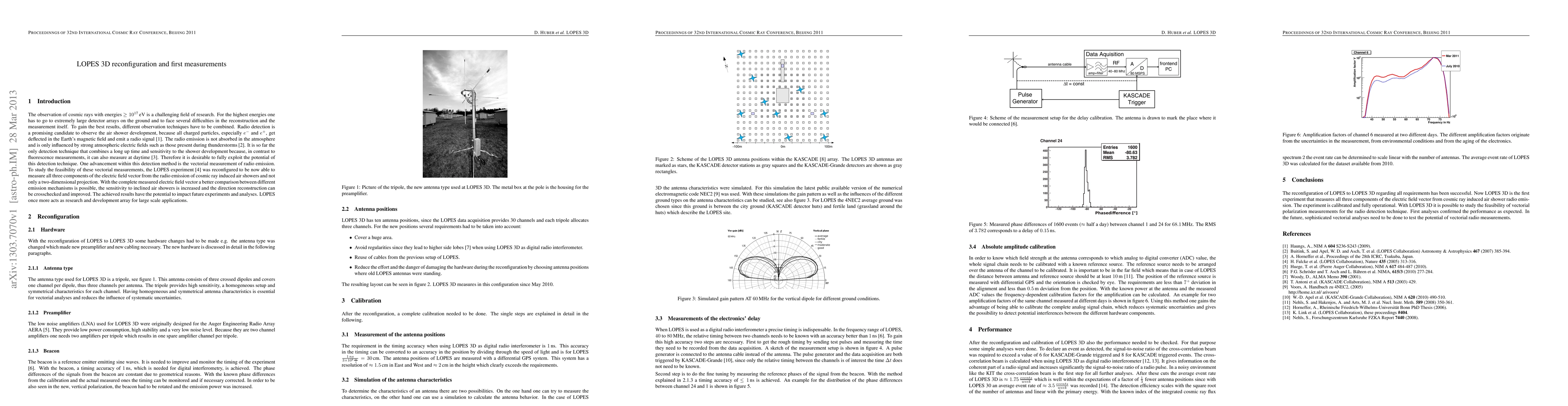 The Radio detection technique of high-energy cosmic rays is based on the radio signal emitted by the charged particles in an air shower due to their deflection in the Earth's magnetic field. The LOPES experiment at Karlsruhe Institute of Technology, Germany with its simple dipoles made major contributions to the revival of this technique. LOPES is working in the frequency range from 40 to 80 MHz and was reconfigured several times to improve and further develop the radio detection technique. In the current setup LOPES consists of 10 tripole antennas which measure the complete electric field vector of the radio emission from cosmic rays. LOPES is the first experiment measuring all three vectorial components at once and thereby gaining the full information about the electric field vector and not only a two-dimensional projection. Such a setup including also measurements of the vertical electric field component is expected to increase the sensitivity to inclined showers and help to advance the understanding of the emission mechanism. We present the reconfiguration and calibration procedure of LOPES 3D and discuss first measurements.