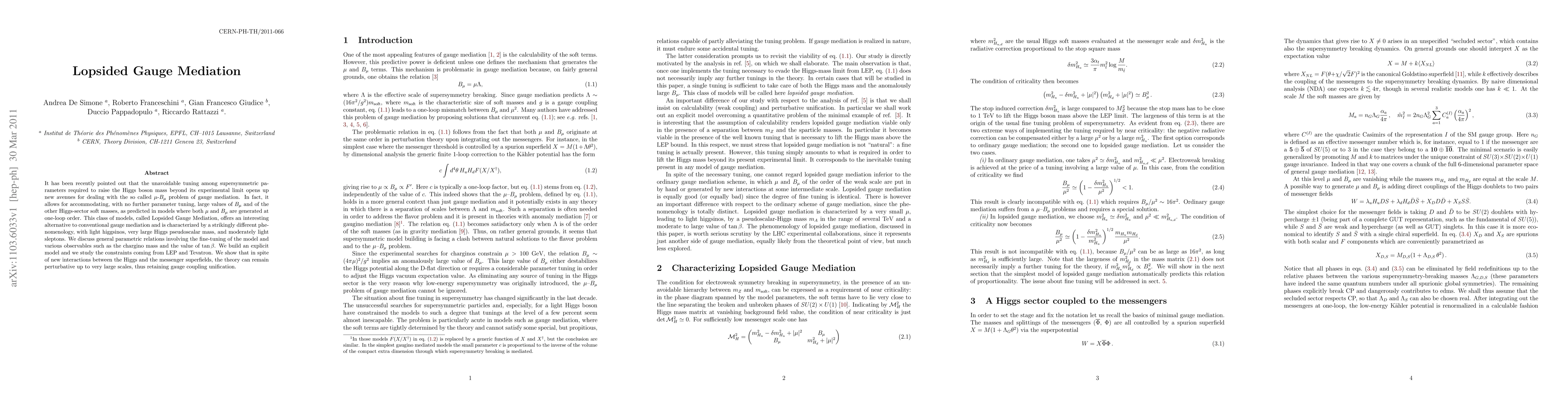 Lopsided Gauge Mediation presents an alternative to conventional gauge mediation, addressing the $\mu$-$B_\mu$ problem without additional parameter tuning, featuring light higgsinos, large Higgs pseudoscalar mass, and moderately light sleptons. The model remains perturbative and maintains gauge coupling unification despite new Higgs-messenger interactions.