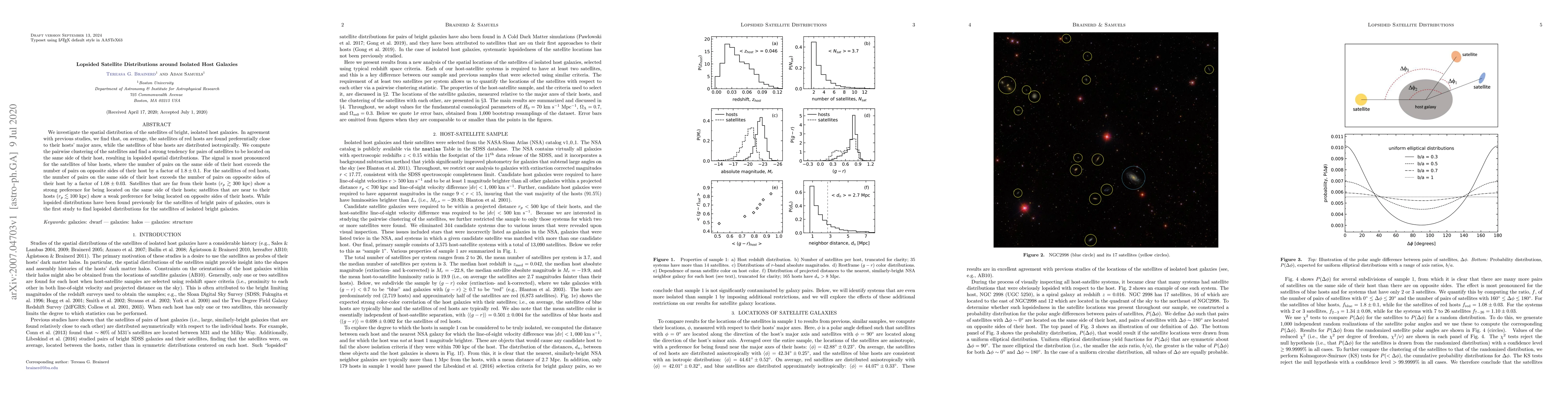 This study reveals that satellites around isolated, bright host galaxies exhibit lopsided distributions, with blue hosts showing a stronger tendency for satellites to cluster on the same side compared to red hosts. The satellite pairs of blue hosts are found on the same side by a factor of 1.8 times more than on opposite sides.