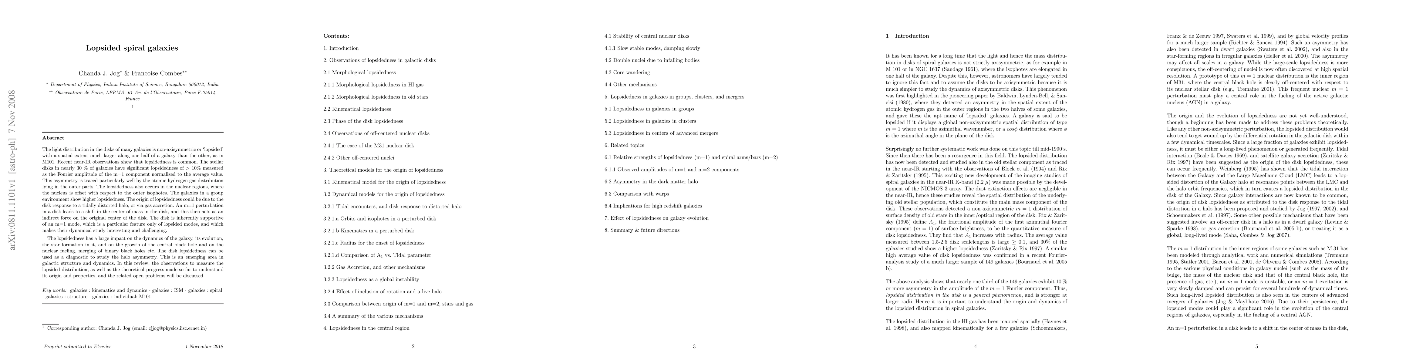 This paper explores the phenomenon of lopsidedness in spiral galaxies, noting that nearly 30% exhibit significant asymmetry in their stellar disks. The study highlights that this asymmetry is often traced by the distribution of atomic hydrogen gas and can influence galaxy dynamics, evolution, and star formation. The paper reviews observational methods and theoretical models to understand the origins of this lopsidedness, suggesting it may result from tidal forces or gas accretion, and discusses its implications for galactic structure and dynamics.