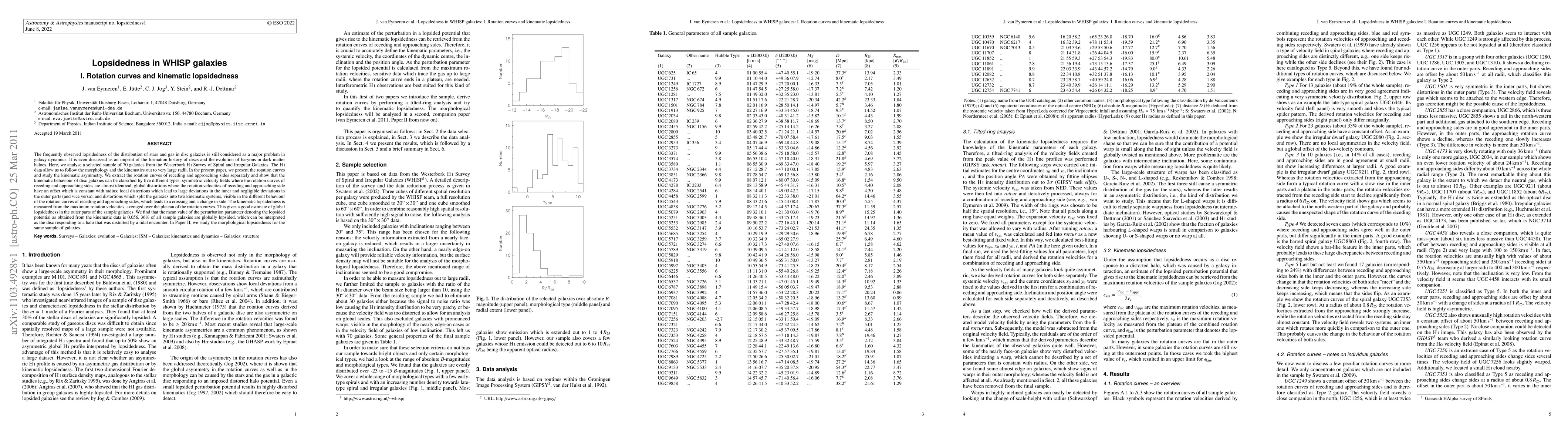 This paper analyzes 70 galaxies from the WHISP survey to study their rotation curves and kinematic lopsidedness, classifying them into five types based on their velocity fields. The mean perturbation parameter for lopsidedness is 0.056, indicating that 36% of the galaxies exhibit global lopsidedness likely due to tidal interactions with their dark matter halos.